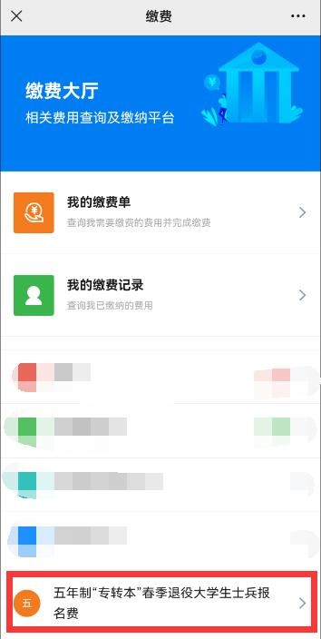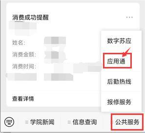 2.进入“你好苏大应用”微信公众号后,点击底部菜单“公共服务” 〉〉 “应用通”,打开“应用通缴费”界面〉〉选择《五年制“专转本”春季退役大学生士兵报名费》缴费项;