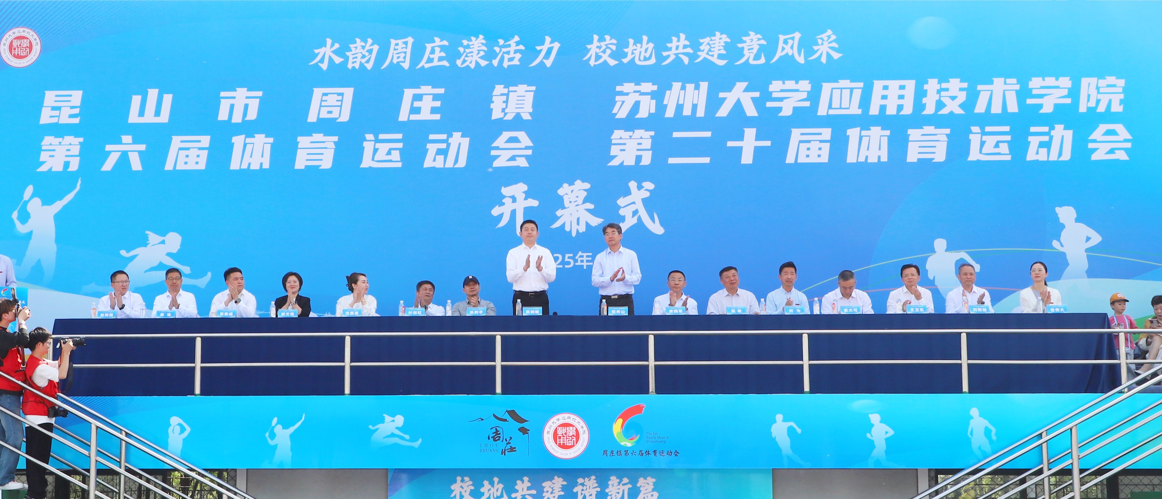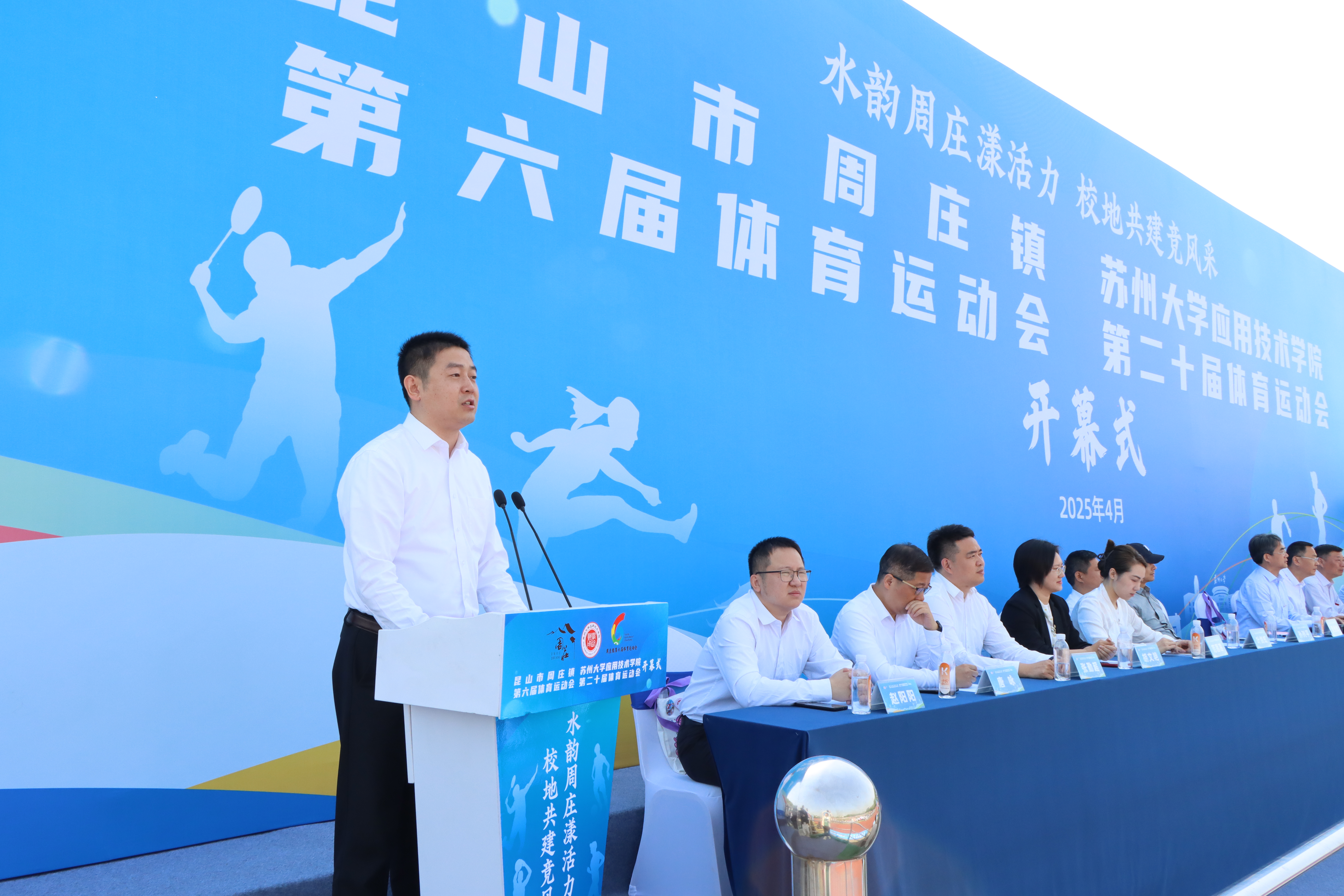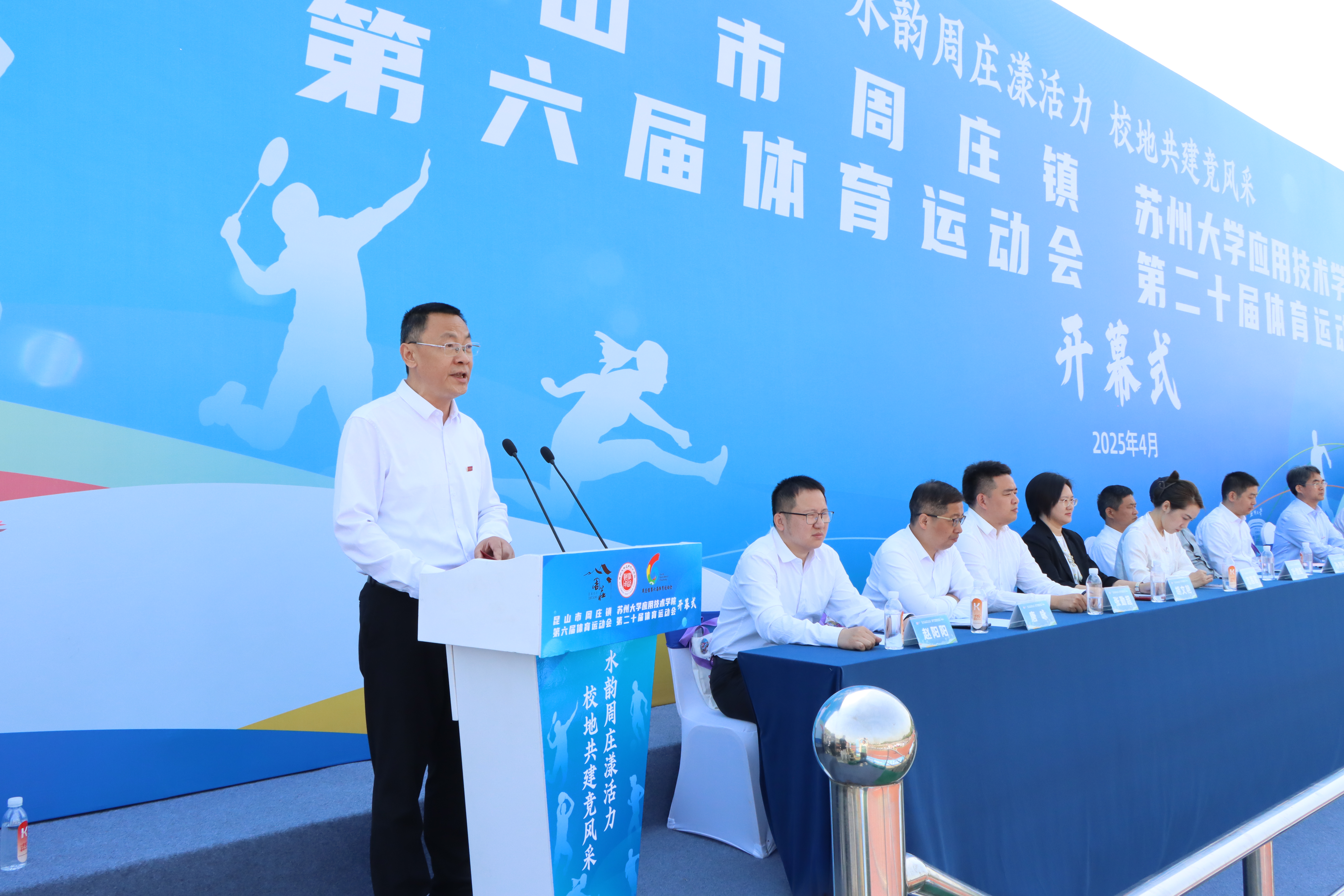 吴剑峰在致辞中热情回应:“千年水乡的文化底蕴与苏州大学应用技术学院的青春活力交相辉映,赋予了本次赛事独特的文化内涵与时代价值。这不仅是体育竞技的舞台,更是文化传承的载体、校地合作的桥梁、全民参与的盛会……希望以本届运动会为契机,把赛场上的激情转化为干事创业的动力,把团结协作的精神融入到工作实践中,以更加强健的体魄、更加饱满的热情、更加昂扬的斗志,积极投身周庄高质量发展的生动实践,共同谱写校地融合、民生幸福的新篇章!”