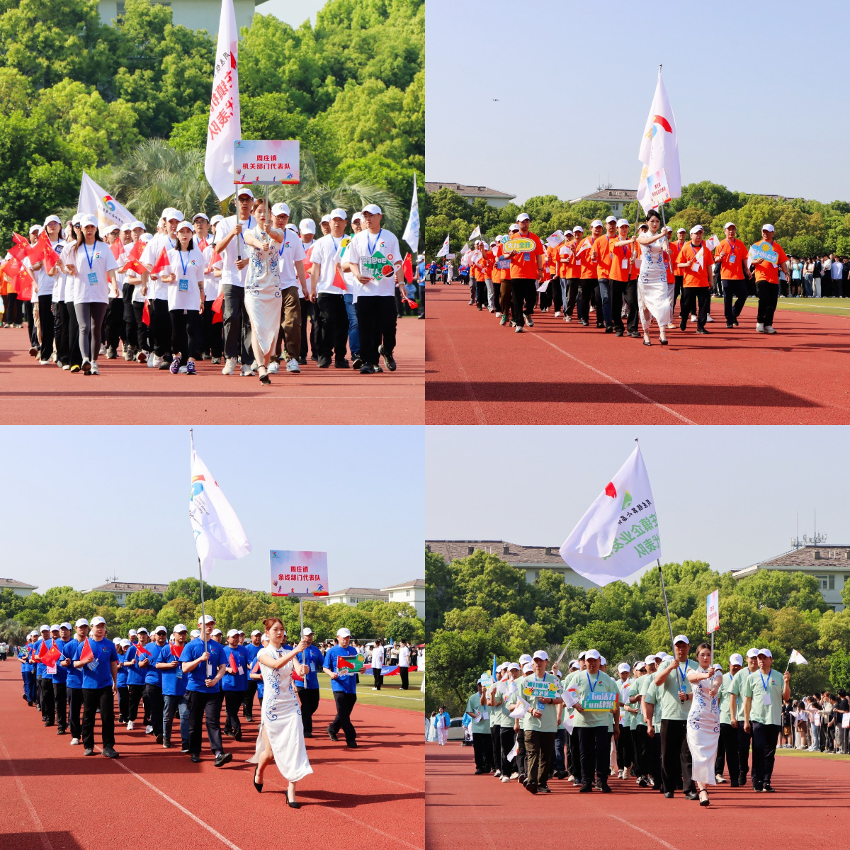 上午8时30分,伴随着激昂的进行曲,国旗护卫队以挺拔身姿率先入场,院旗、会旗与彩旗方阵紧随其后。各代表队依次亮相,以创意表演点燃全场热情:周庄镇4支代表队方阵身着特色服饰,带着各自行业的热情,手持彩旗依次挥手入场;裁判员方阵目光坚毅、精神饱满,用专业与公正为赛事护航;工学院学生方阵以机器人开道,活力操与机器人的互动彰显科技未来感;工学院的退役士兵方阵则以铿锵有力的军体拳展现了军人风采;文旅学院学子衣袂翩跹,以敦煌舞蹈再现丝路神韵;商学院方阵用动感舞步诠释了青春朝气。