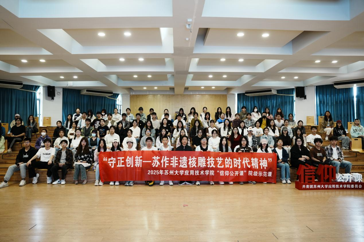 为深入学习贯彻习近平新时代中国特色社会主义思想和党的二十大精神,根据苏州大学应用技术学院第二届“芬芳”大学生艺术文化节的总体安排,为弘扬中华优秀传统文化,激发青年学子对非遗技艺的热爱,4月23日下午,苏州大学应用技术学院“素养公开课”院级示范课在安如楼101教室举办。活动以“守正创新——苏作非遗核雕技艺的时代精神”为主题,特邀国家级非物质文化遗产项目(核雕技艺)区级代表性传承人、江苏省工艺美术名人夏栋担任主讲人。2025年苏州大学“青年马克思主义者培养工程”春季班学员、应用技术学院青年学生代表及学生骨干等参加活动。