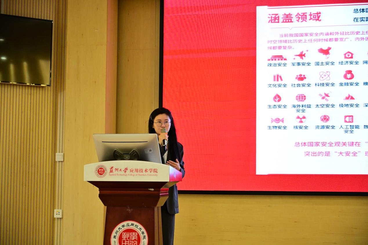 讲座围绕“国家安全,青春挺膺”主题展开。朱老师从不同历史阶段国家安全的发展脉络入手,深入浅出地阐述了总体国家安全观的形成与丰富发展。她指出,当前我国国家安全内涵和外延比历史上任何时候都要丰富,时空领域宽广,内外因素复杂,面临着诸多挑战。例如,2021年依法关停网络水军账号620万余个、网站1200余个;以美国为首的西方国家对我国传统安全和非传统安全领域进行渗透;境外暴恐组织借助网络传播暴恐音视频,以交友、兼职等为诱饵实施拉拢策反等。