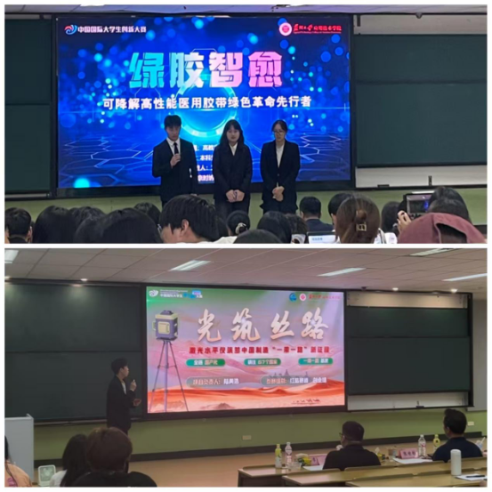 在孚新楼101赛场,智能科技类项目成为焦点。其中,“绿胶智愈——可降解高性能医用胶带绿色革命先行者”项目利用创新可降解材料替换传统胶带,以智能科技引领医用胶带绿色革命,获得评委一致好评。103赛场的“光筑丝路——激光水平仪筑梦中国制造‘一带一路’新征程”通过全链国产化研发、定制化服务及覆盖67国的市场布局,展现了中国制造赋能“一带一路”基建的创新实力与共促发展的责任担当。