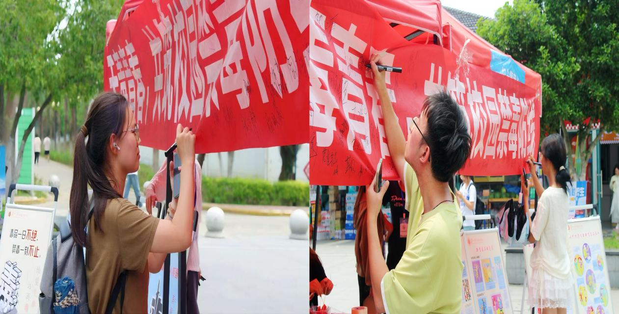 在横幅签字留念环节,师生们积极响应,有序地走向写有“无毒青春,共筑校园禁毒防线”的横幅。大家神情庄重,郑重地在横幅上留下自己的名字,承诺将从自身做起,远离毒品,积极参与禁毒宣传。现场气氛热烈非凡,横幅上密密麻麻的名字,如同一颗颗坚定的决心汇聚在一起,彰显了大家携手抵制毒品、共筑校园禁毒防线的共同决心。