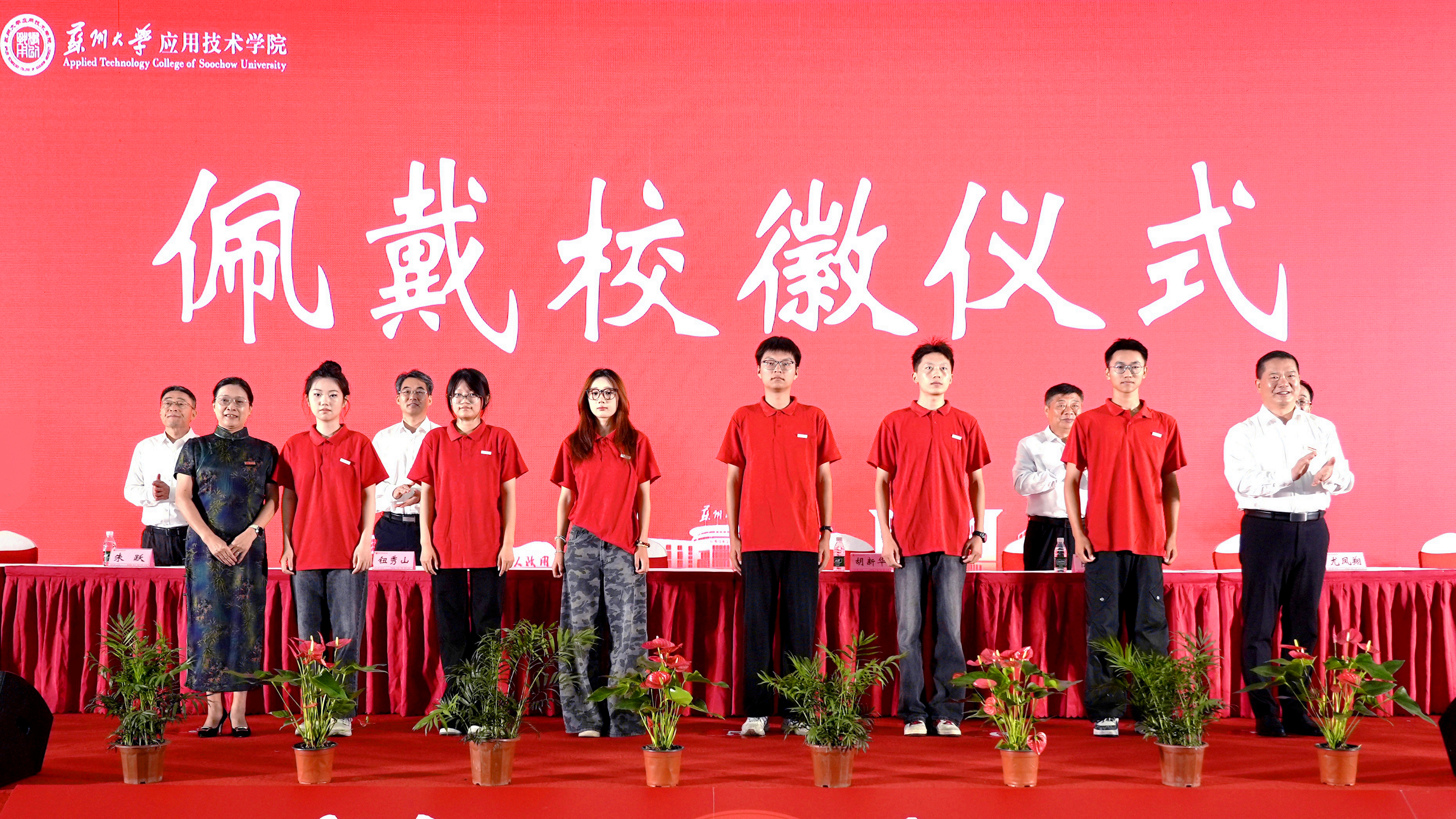 随后举行的佩戴校徽仪式将典礼推向了高潮。院长傅菊芬、党委书记胡新华为新生代表佩戴校徽,全体新生郑重地将校徽佩戴在胸前,正式成为了“苏应人”。胡新华书记激励青年学子“在苏应校园扎实完成课堂学习,积极投身企业实践和项目研发,在真实场景中锤炼真才实学,把‘学以致用’的院训,写进每一次实践、每一个挑战,努力成长为扎根地方、服务产业的‘有理想、敢担当、懂实践、能创新’的新时代人才。”