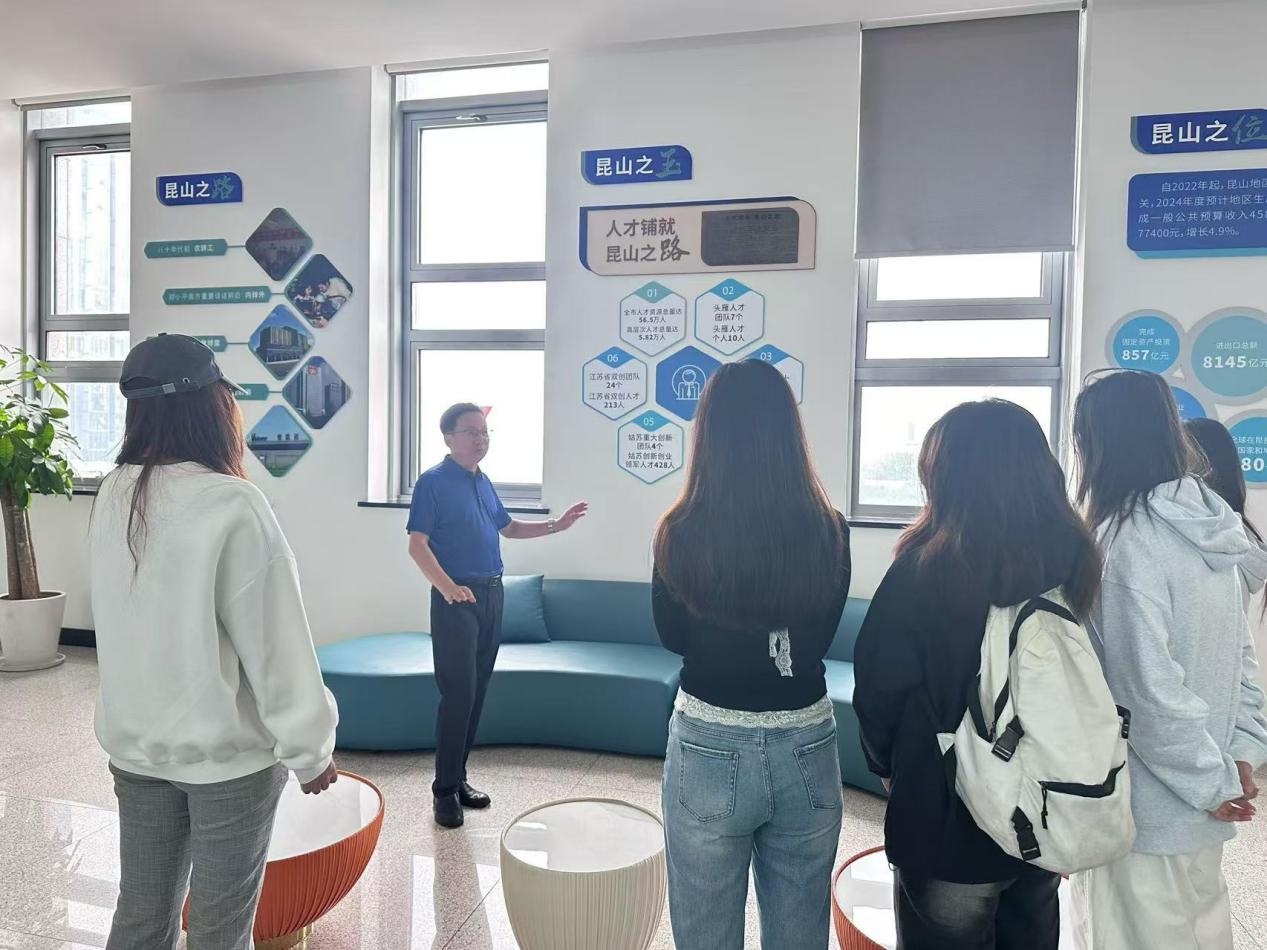 昆山人力资源市场董事长游心东亲自担任“讲解员”,为我院学生详细介绍昆山“2+3+3”新兴产业体系,即以新一代电子信息、高端装备制造两大产业为主导,重点发展智能网联汽车、具身智能、低空飞行器三大新兴产业,以及高端食品、时尚创意、消费医疗三大特色产业。他强调,当前昆山正加速构建现代产业体系,对技术技能人才的需求日益迫切。“一张动态热力图,让我们瞬间看懂昆山产业正在哪里‘长’出新高峰,也看懂自己未来可以‘长’在哪里。”2022级电子信息科学与技术专业的韦同学兴奋地说。