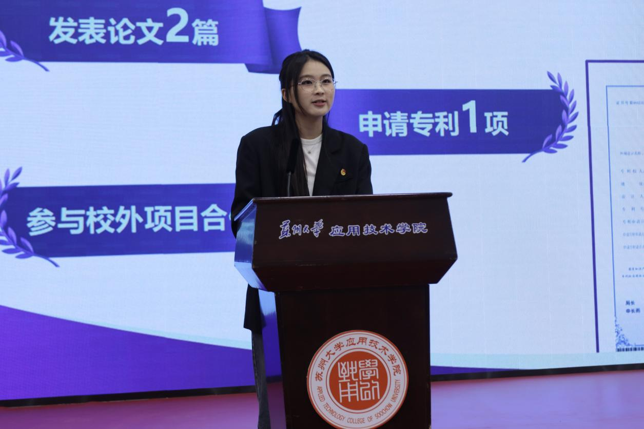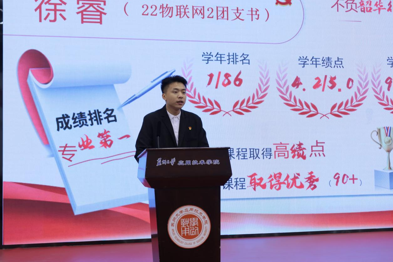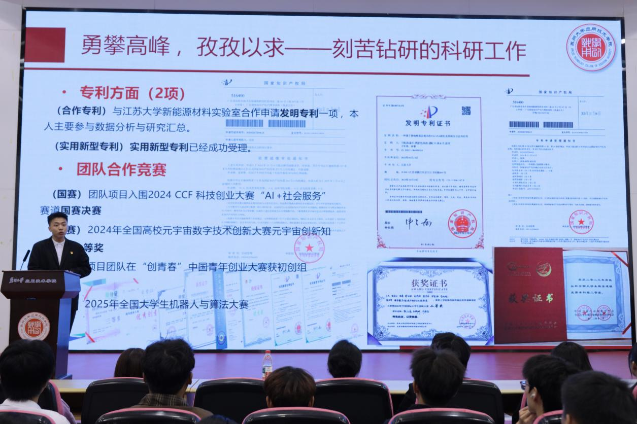 工学院22物联网2班徐睿,他以“一万年太久,只争朝夕”为核心主题,分享了从班级第四逆袭至连续四学期专业第一的蜕变历程。他详述了科研竞赛“大一着手、大二沉淀、大三收获”的黄金时间规划,拆解了论文发表、专利申请、软著撰写的入门技巧,更分享了在学生工作中统筹协调、在志愿服务中践行担当的宝贵经验,传递了“以理想为帆、以奋斗为桨、以创新为刃”的青春信念。