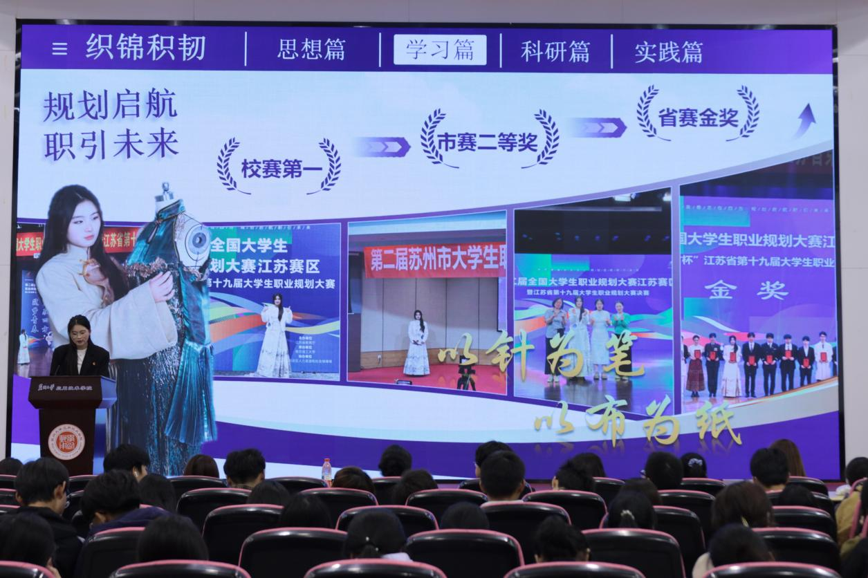 最后,文旅学院22服装1班张逸飞以服装专业特有的“量体、选料、裁剪、缝制”为喻,串联起完整的成长轨迹。思想淬炼是为人生“量体定版”,她分享了从内向拘谨到主动突破的转变,鼓励同学们通过脱敏练习、小事积累建立自信;学业深耕是“织就学识锦缎”,她强调学业是一切探索的基石,建议大家跳出课堂局限,利用线上资源与行业动态拓展认知边界;科研创新是“淬炼独特工艺”,她以自身外观专利和论文发表经历,说明创新可从细节尝试与跨界学习起步;实践奉献是“赋予作品温度”,她讲述了暑期支教与企业实习的感悟,诠释了设计“好看更要好用”、实践“知行合一”的深刻内涵。