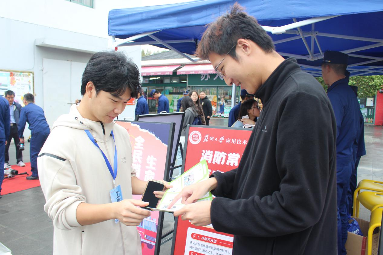 仪式后的互动环节成为宣传亮点。工作人员向师生发放消防知识宣传单,详细解读校园消防安全注意事项;大学生安全管理中心学生现场展示宿舍违章电器、违禁物品,结合案例说明其火灾隐患;昆山消防救援大队消防员逐一演示救援呼吸机、破拆锯等器材的使用方法,邀请师生现场实操体验。活动特别设置了消防安全知识有奖竞赛环节,以问答形式巩固师生学习成果,现场参与热情高涨。