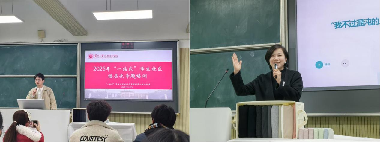 为积极响应学院“一站式”学生社区建设要求,进一步提升学生宿舍生活品质,营造安全、健康、和谐的居住环境,11月27日晚,我院在学生社区成功举办楼层长专题培训。本次培训特邀“收纳邦”品牌创始人杨梓担任主讲,活动由学生工作处汤泰老师主持。