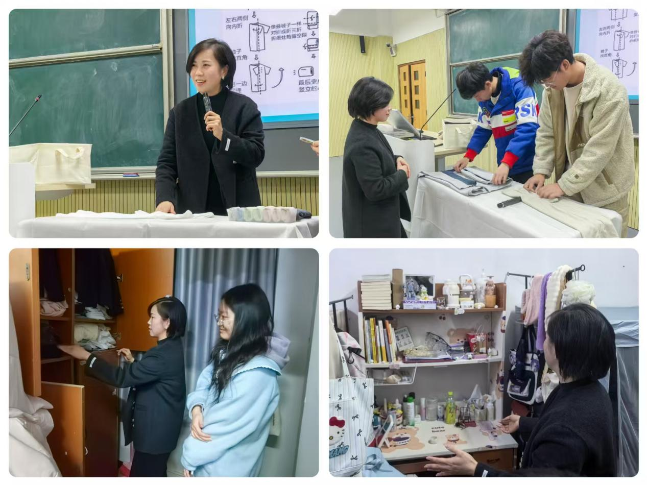 杨梓紧扣“空间优化与效率提升”主题,系统讲授了收纳整理的基础知识与实操技巧。通过真实宿舍场景案例,她生动演示了如何高效规划空间布局、科学划分功能区、维持环境整洁有序。培训设置现场实践环节,邀请学生参与实物收纳操作,及时应用所学技巧。随后,组织参训人员深入学生宿舍实地教学,针对不同宿舍特点现场示范优化方案,手把手指导空间利用要领。通过衣物整理、学习用品收纳、公共空间优化等实操训练,学生们切实掌握了打造舒适宜居宿舍环境的具体方法。