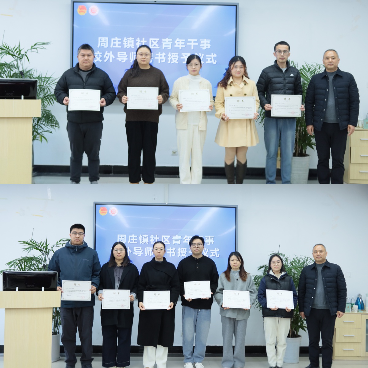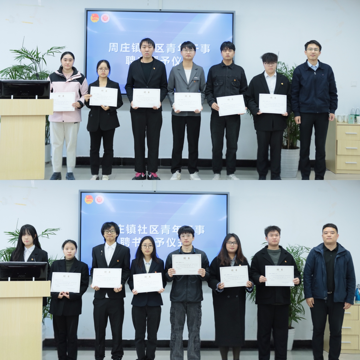 钟义、张勤超为受聘第二届“青年实干家计划”的全体同学颁发了周庄镇社区青年干事志愿者聘书。
