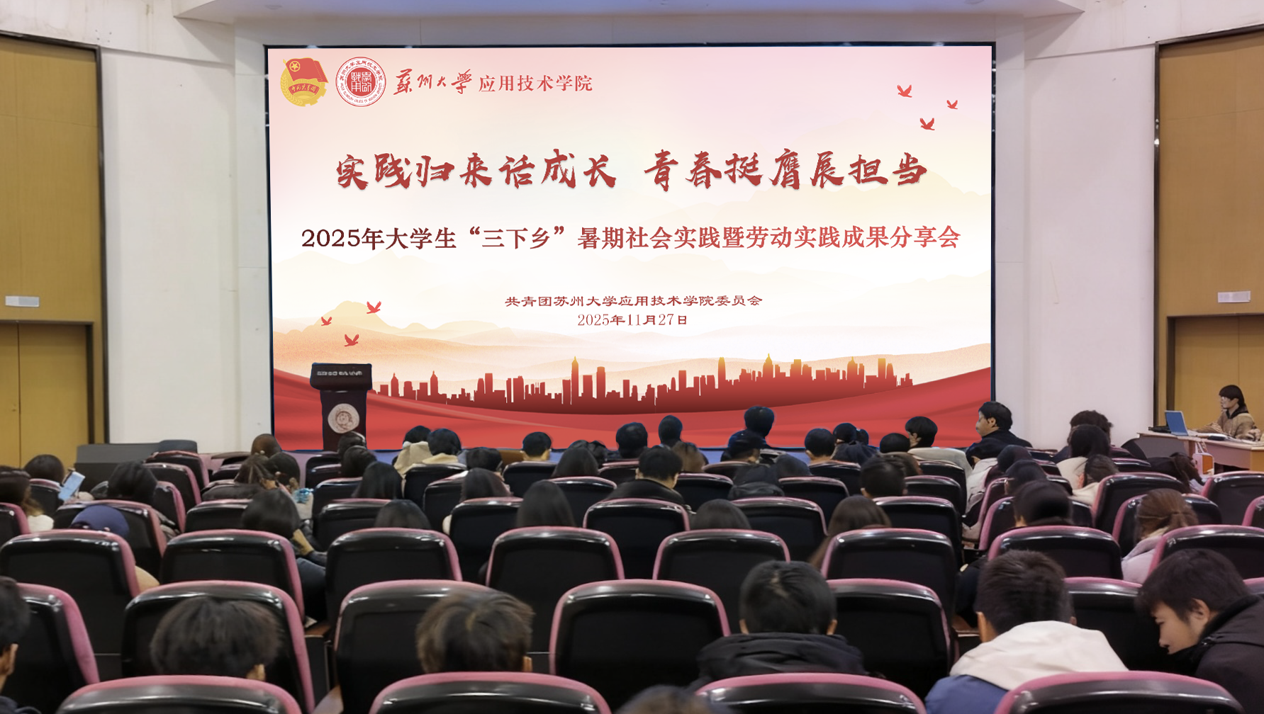 11月27日晚,“实践归来话成长,青春挺膺展担当”——苏州大学应用技术学院2025年大学生“三下乡”暑期社会实践暨劳动实践成果分享会在图书馆五楼报告厅举行。学院团委副书记张玲玲、各实践团成员以及2025年苏州大学应用技术学院“青年马克思主义者培养工程”培训班学员参加了本次活动。