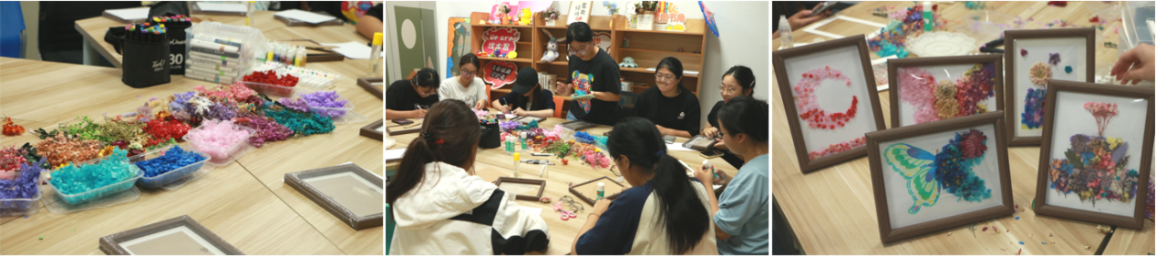 在“双生翼:画与花共舞”干花创意画活动中,同学们将干花拼贴与绘画巧妙融合,于色彩与形态的构思中学习表达情绪、释放压力。专注的手工时光,成为大家静心内观、安放情感的温暖片刻。