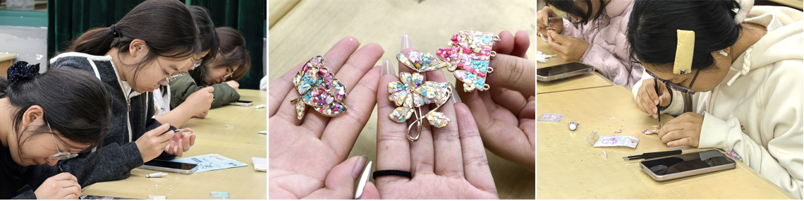 “指尖螺钿,心尖回响”首饰制作活动引入了传统螺钿工艺。同学们细心雕琢、镶嵌拼贴,在慢工细作中与材料对话,体验手作独有的静谧与时光的流动。这一过程不仅磨炼耐心,更让思绪沉淀,收获一份深度的专注与疗愈。