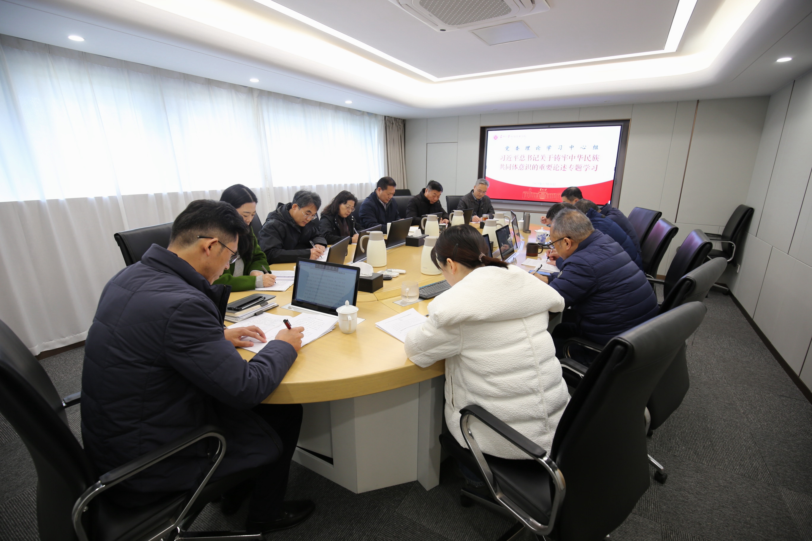 12月16日上午,我院党委理论学习中心组召开集中学习会,专题学习习近平总书记关于铸牢中华民族共同体意识的重要论述。学院党委书记胡新华、副院长席拥军进行领学,党政办公室主任高国平、党委教师工作部部长秦大可、教学科研部部长刘和剑作重点发言。会议由胡新华主持。