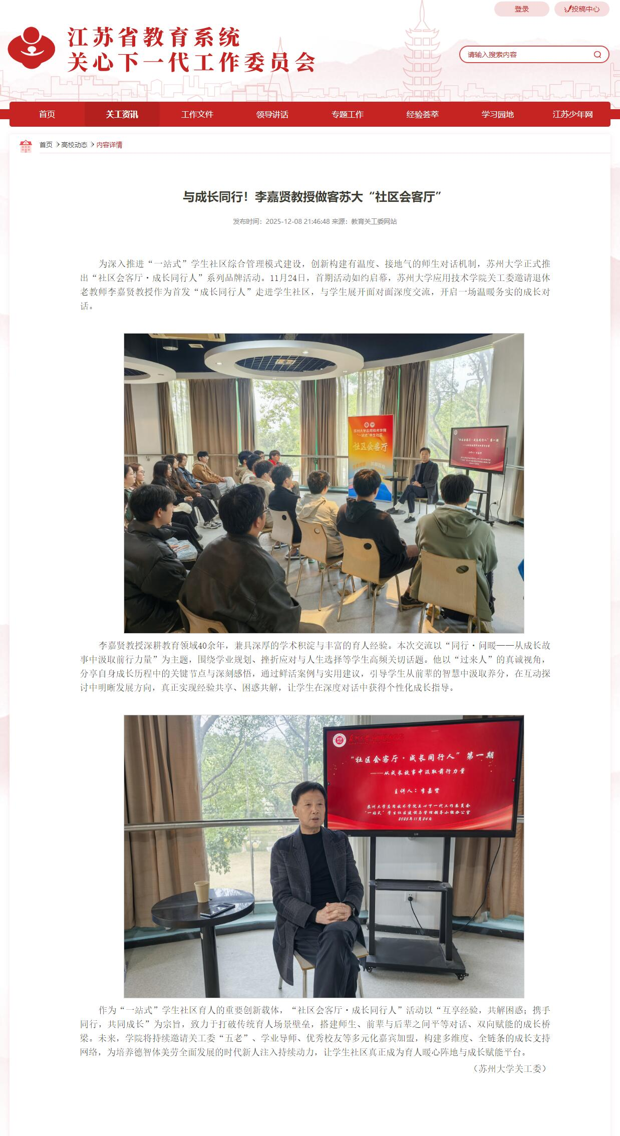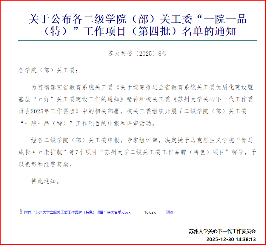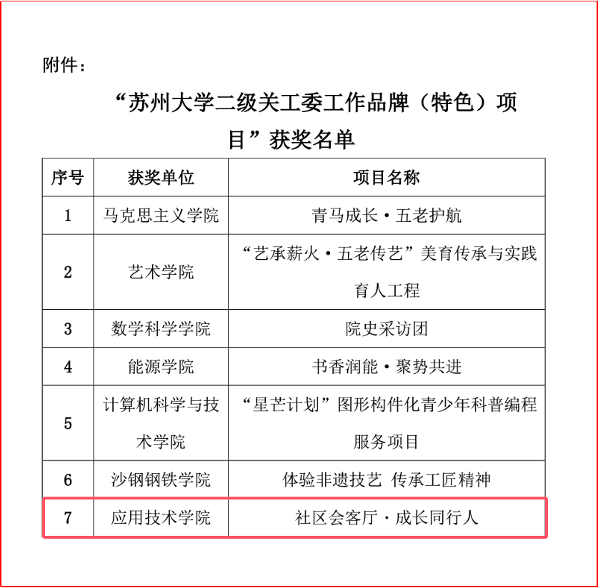近日,我院“一站式”学生社区着力打造的“社区会客厅·成长同行人”入选“苏州大学二级关工委工作品牌(特色)项目”。此次获评,标志着我院关工委工作在校级品牌化建设方面取得重要进展。