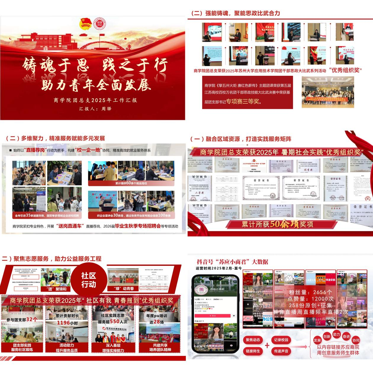 商学院团总支以“铸魂于思,践之于行,助力青年全面发展”为主题,聚焦“厚植信仰”“贡献大局”“服务青年”“实践育人”“精进特色”五个方面系统总结商学院团总支在重点工作中的推进成效、实践成果与特色经验。