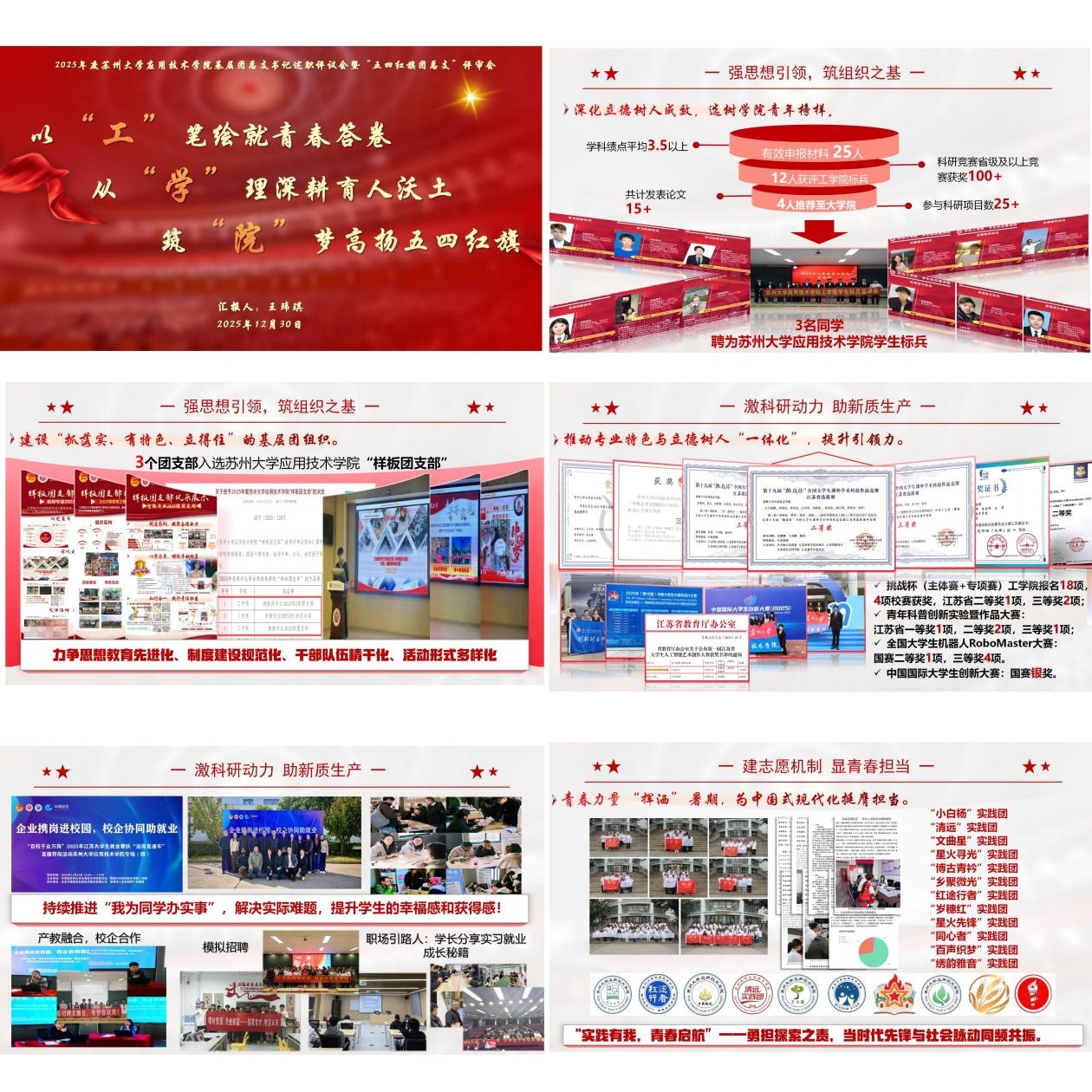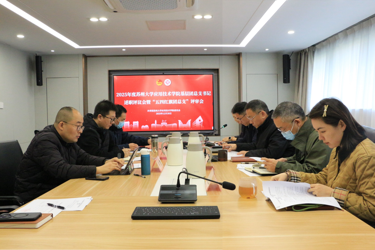 为全面总结我院2025年度共青团工作,充分展示各二级学院团总支在新时代运用新思想、新方法、新理念取得的新成果,有效提升共青团的引领力、组织力、服务力,高质量建设“青年身边的共青团”,12月30日上午,2025年度苏州大学应用技术学院基层团总支书记述职评议会暨“五四红旗团总支”评审会在图书馆510会议室举行。学院副院长席拥军,党委教师工作部部长秦大可,党委学生工作部部长严永伟,各二级学院党总支书记以及相关负责同志参加了会议。