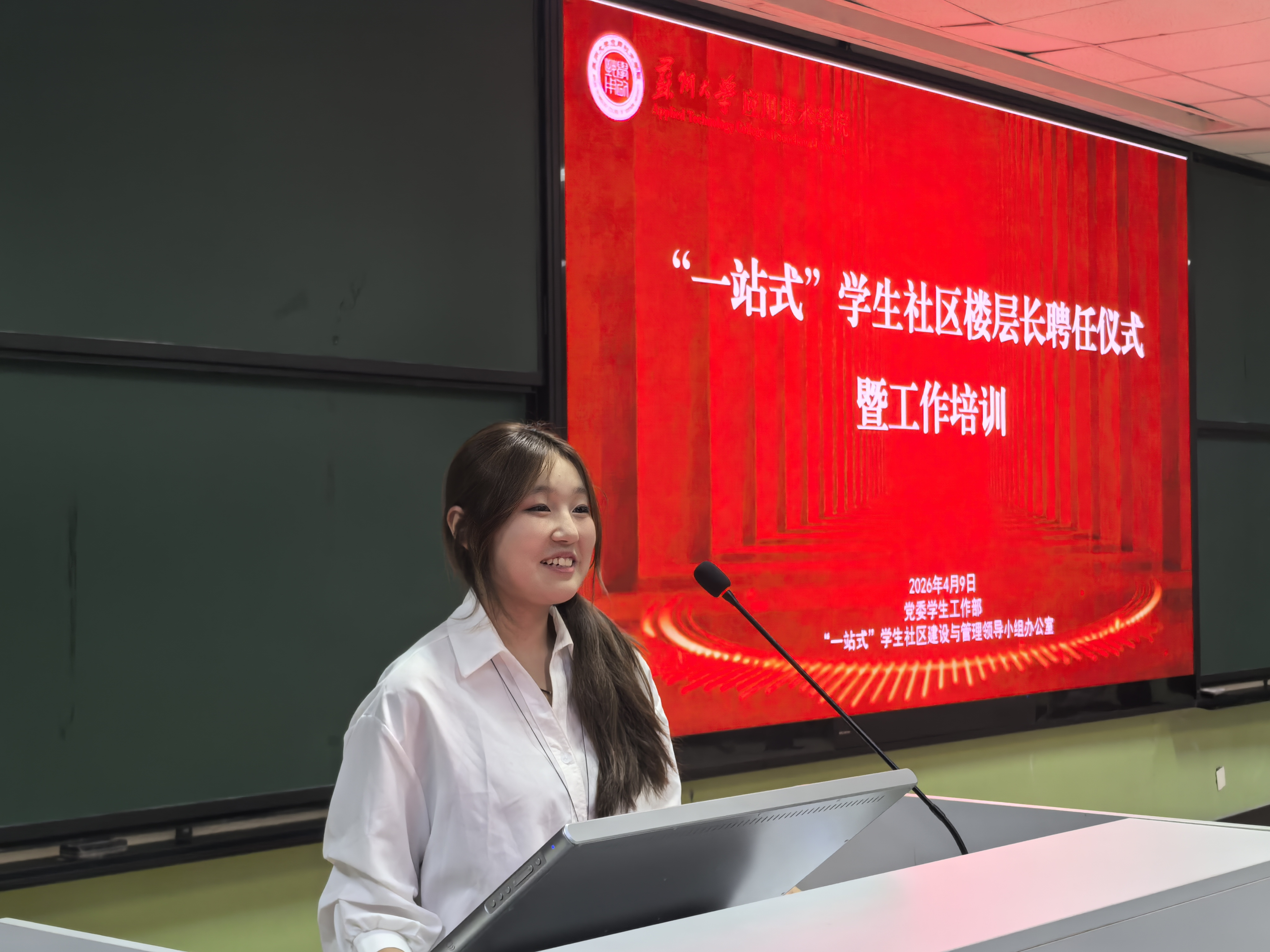 席拥军向全体受聘楼层长表示热烈祝贺。他指出,“一站式”学生社区是思政教育、日常治理、服务保障的第一线,楼层长是连接学院与学生的重要纽带,是社区安全的守护者、服务同学的贴心人、和谐氛围的促进者。他对全体楼层长提出三点要求:一要扛起责任,做履职尽责的“有心人”,抓实日常巡查、安全监督、诉求反馈等基础工作;二要践行服务,做同学身边的“贴心人”,倾听心声、化解矛盾、传递温暖;三要当好表率,做文明风尚的“带头人”,以身作则引领社区优良风气。他要求全体社区工作教师强化指导、做好保障,为楼层长高效履职保驾护航。