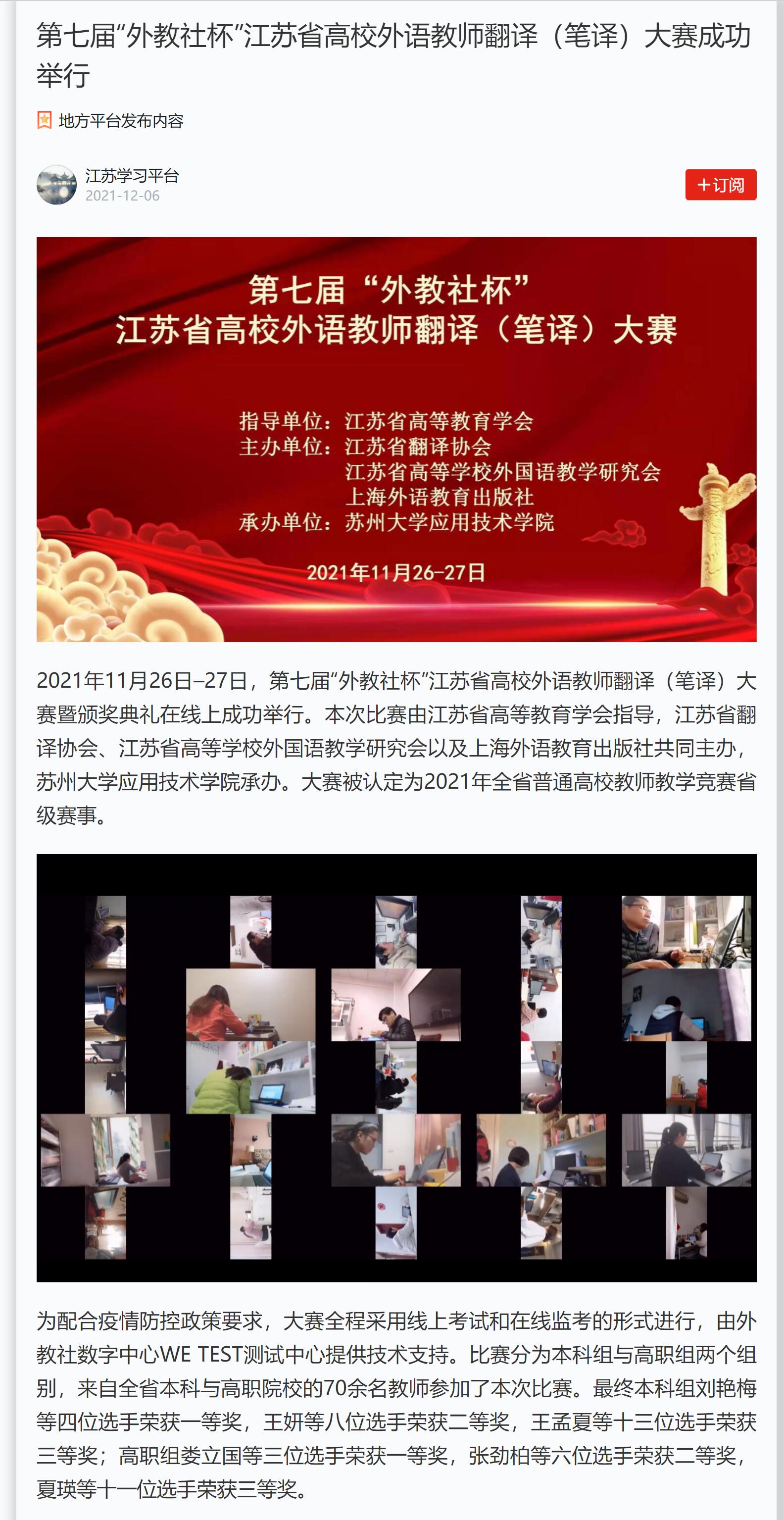 学习强国:第七届“外教社杯”江苏省高校外语教师翻译(笔译)大赛成功举行