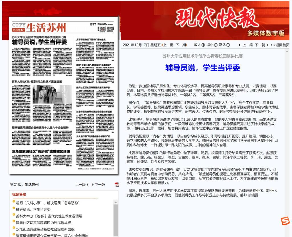 现代快报:苏州大学应用技术学院举办青春校园演讲比赛
