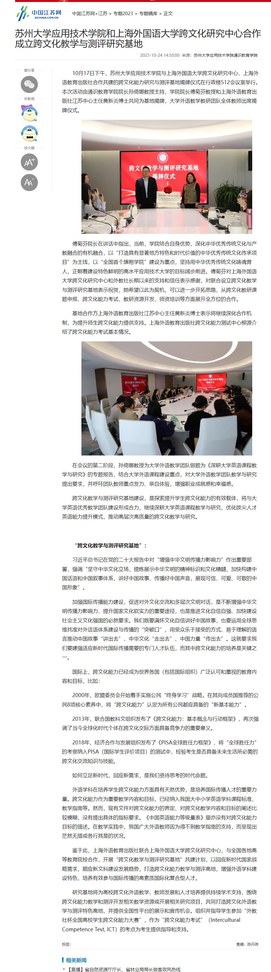 中国江苏网:苏州大学应用技术学院和上海外国语大学跨文化研究中心合作成立跨文化教学与测评研究基地