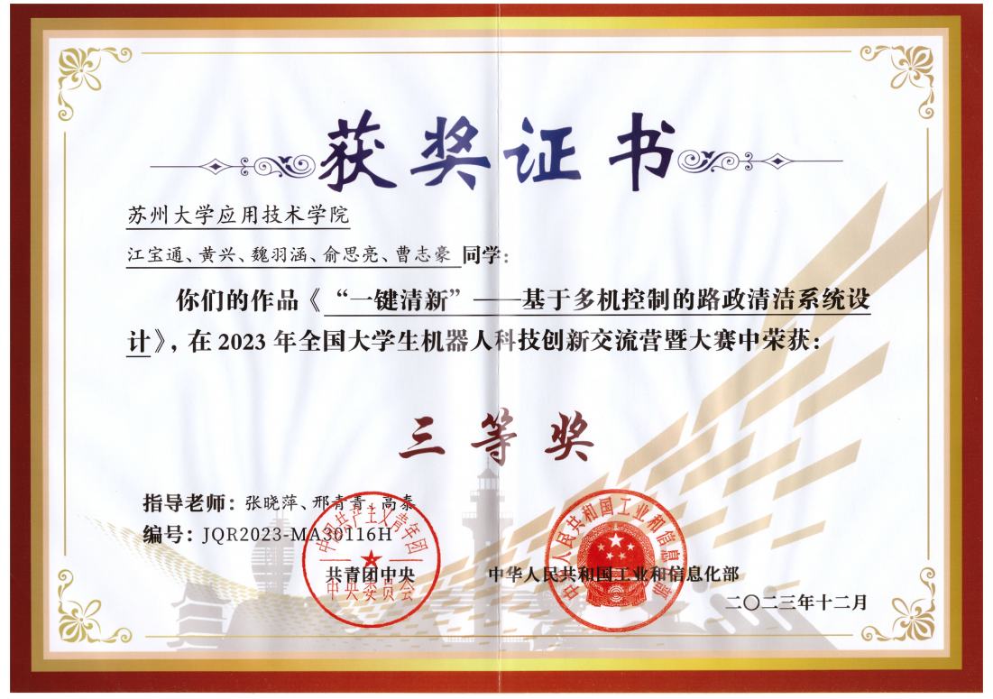 近日,我院收到由共青团中央、中华人民共和国工业和信息化部主办的2023年全国大学生机器人科技创新交流营暨大赛的荣誉证书。我院选送的作品《“一键清新”——基于多机控制的路政清洁系统设计》在本次大赛中荣获全国三等奖。