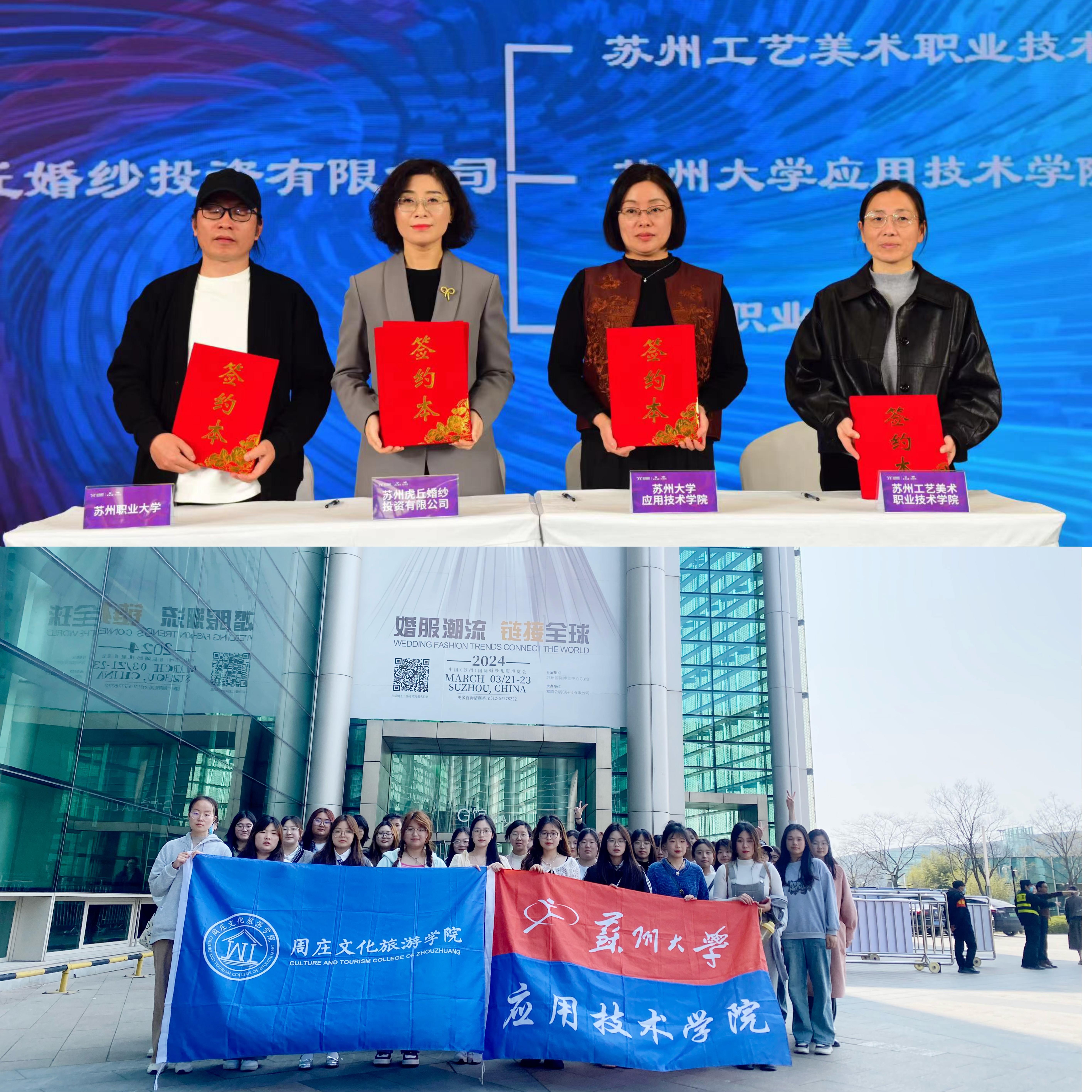 本次大赛适逢2024中国(苏州)国际婚纱礼服博览会,为创新校企人才共育模式,深化教学与产业合作,我院与苏州虎丘婚纱投资有限公司进行校企合作签约。此次校企签约仪式搭建起多元化、深层次的合作交流平台,为培养应用型服装设计人才、促进产业与人才供需精准对接助力。