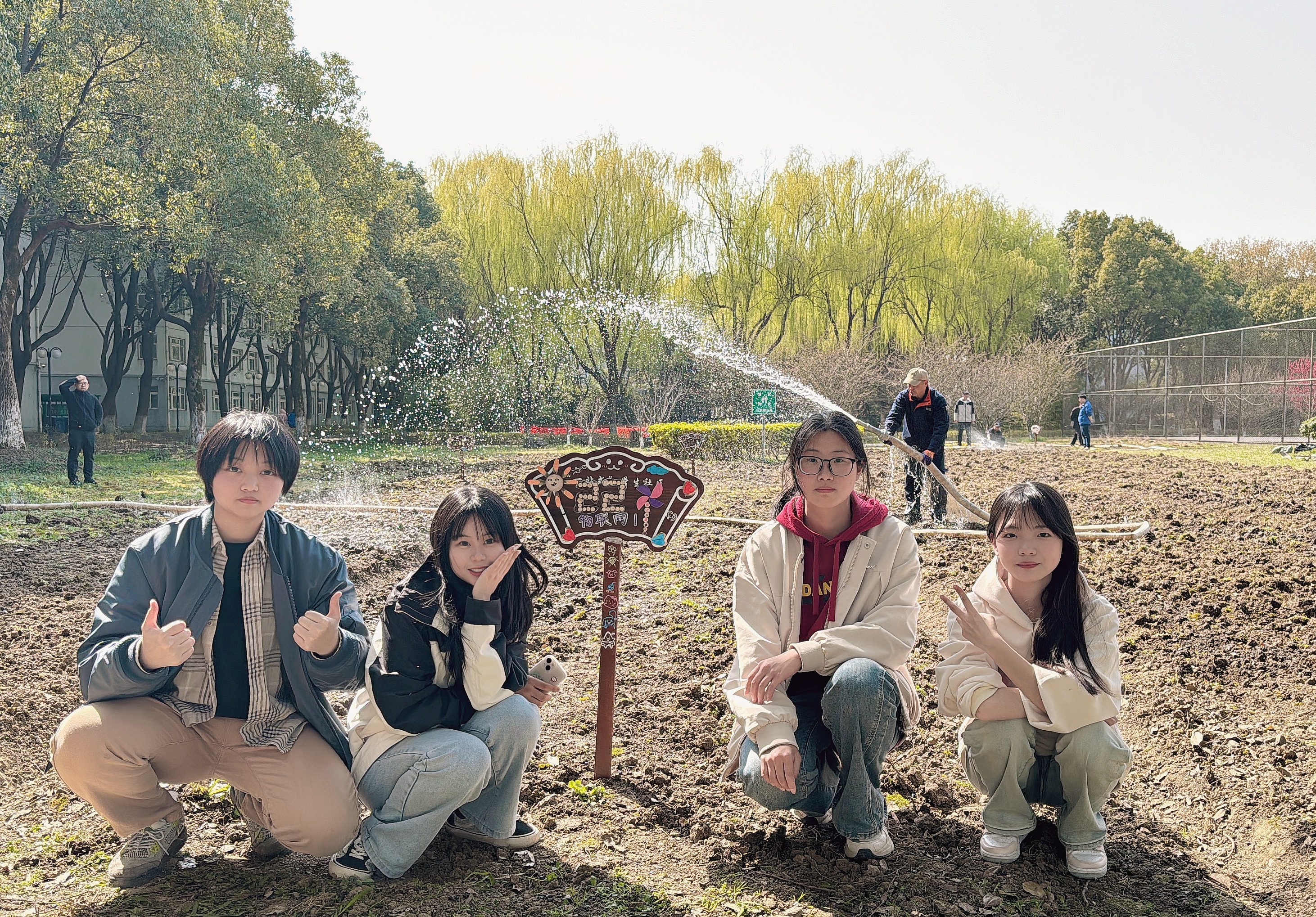 授牌仪式后,工学院学生第二党支部和8个团支部同学有序领取花种和工具,对分配好的土地开始清理杂草、松土、撒草籽、浇水,定期做好浇水养护工作。
