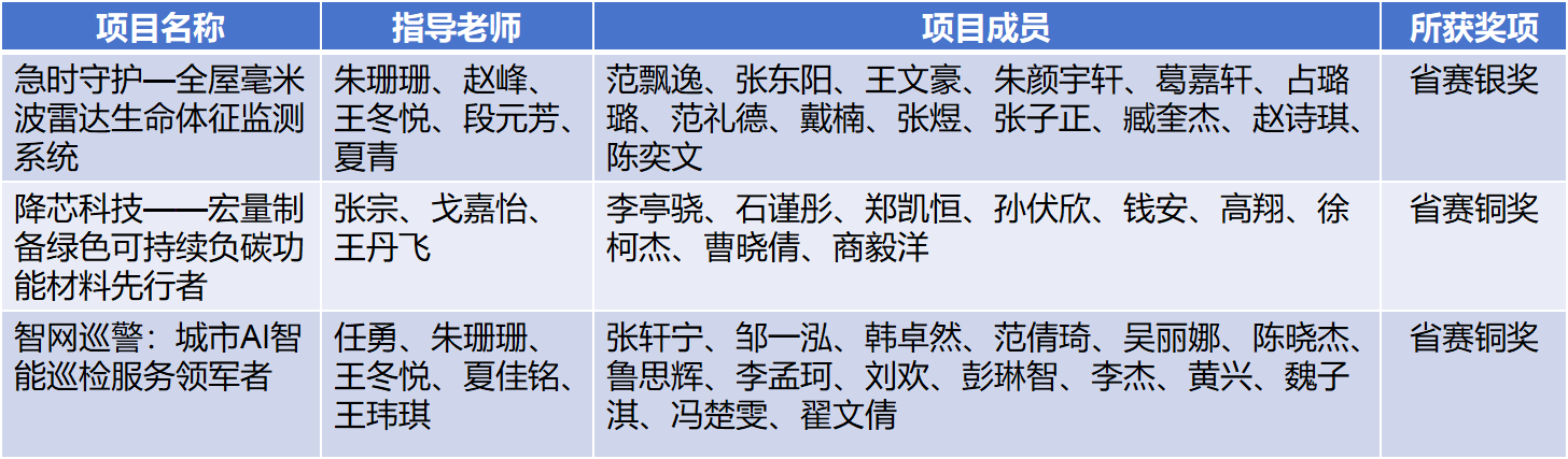 我院由朱珊珊、赵峰、王冬悦、段元芳、夏青老师指导,工学院同学完成的作品《急时守护——全屋毫米波雷达生命体征监测系统》获银奖;由张宗、戈嘉怡、王丹飞老师指导,商学院同学完成的作品《降芯科技——宏量制备绿色可持续负碳功能材料先行者》获铜奖;由任勇、朱珊珊、王冬悦、夏佳铭、王玮琪老师指导,工学院、商学院、文旅学院同学完成的作品《智网巡警:城市AI智能巡检服务领军者》获铜奖。