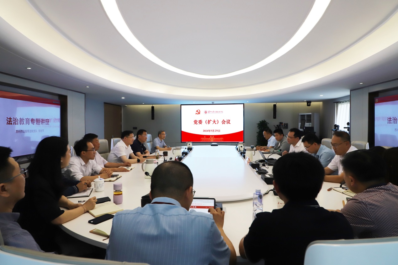 为进一步推动党纪学习教育走深走实,引导全院广大党员干部增强党性、严守纪律、砥砺作风,5月29日下午,学院在图书馆512会议室召开党委扩大会议暨党纪学习教育专题学习会,会议邀请苏州市公安局法制支队邹冬平作法治教育专题讲座。学院党委委员,党委主要部门负责人,各党总支书记、党支部书记参加此次会议。会议由党委书记孙庆民主持。