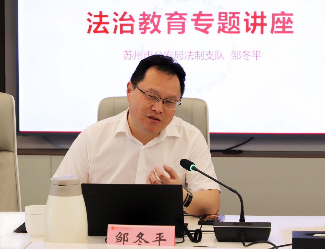 会上,邹冬平围绕“法治意识”“校园安全”“与生活相关的法律问题”三方面展开阐述,结合各种典型案例深入浅出地讲解了法律常识及预防犯罪措施。通过以案释法、以案学法,警醒广大师生要自觉抵制不良诱惑,提高辨别能力,远离违法犯罪;通过深刻剖析违纪典型案例,加强警示教育,用身边事教育身边人,让党员干部受警醒、明底线、知敬畏。邹冬平表示,高校教师是学生全面发展的引领者,希望苏应教师在履行教育职责的同时,以案为鉴,警钟长鸣,坚守师德底线,切实营造风清气正的和谐校园。