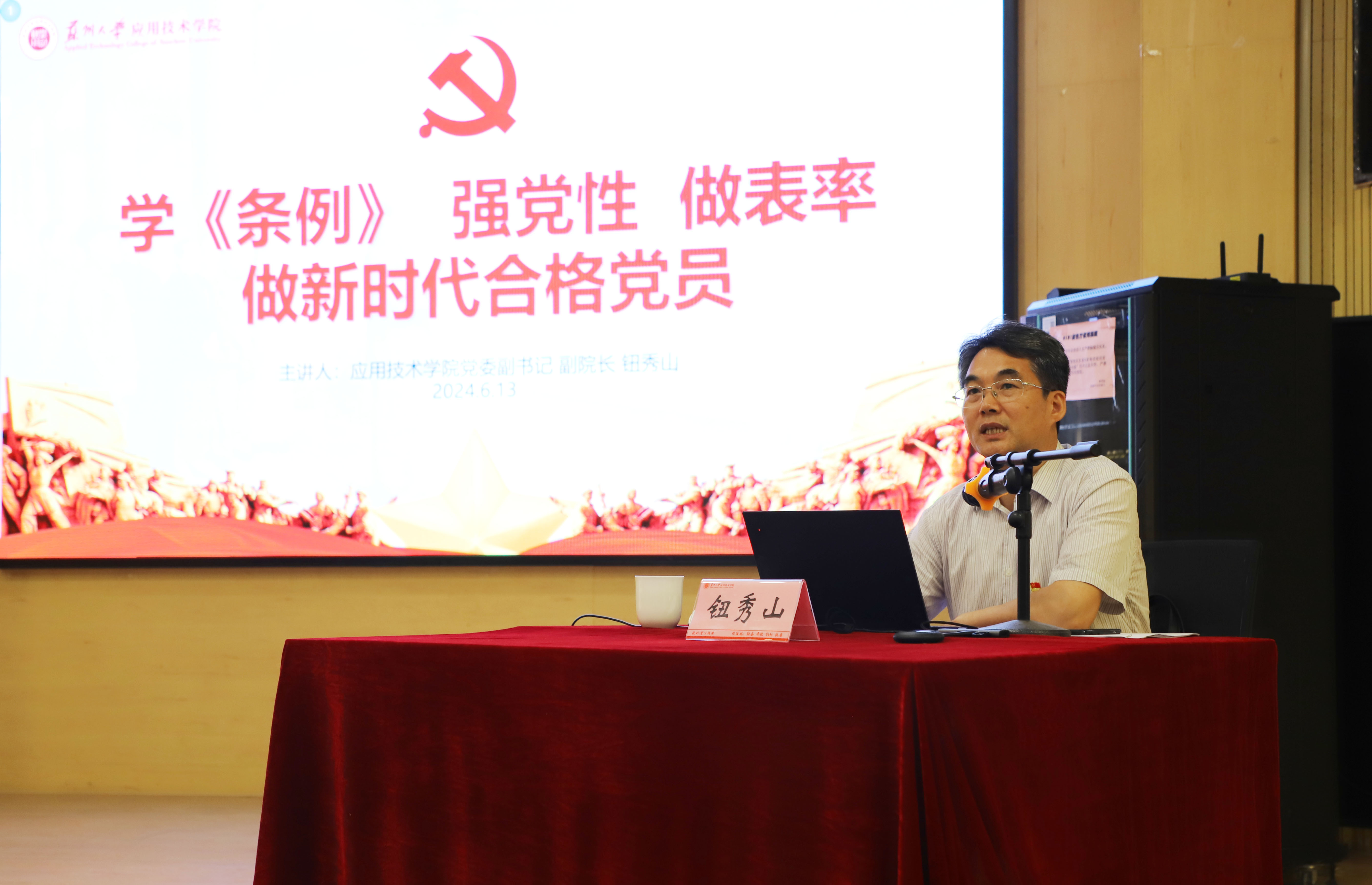 为进一步加强毕业生党员教育管理,强化理想信念教育,增强毕业生党员纪律意识、提高党性修养,6月13日晚,学院党委副书记、副院长钮秀山以《学<条例>强党性 做表率 做新时代合格党员》为主题,在安如楼101为2024届毕业生党员讲授专题党课。各二级学院党总支书记、学生党支部书记以及2024届毕业生党员参加了本次党课,党课由学院党政办公室副主任吴晓宇主持。