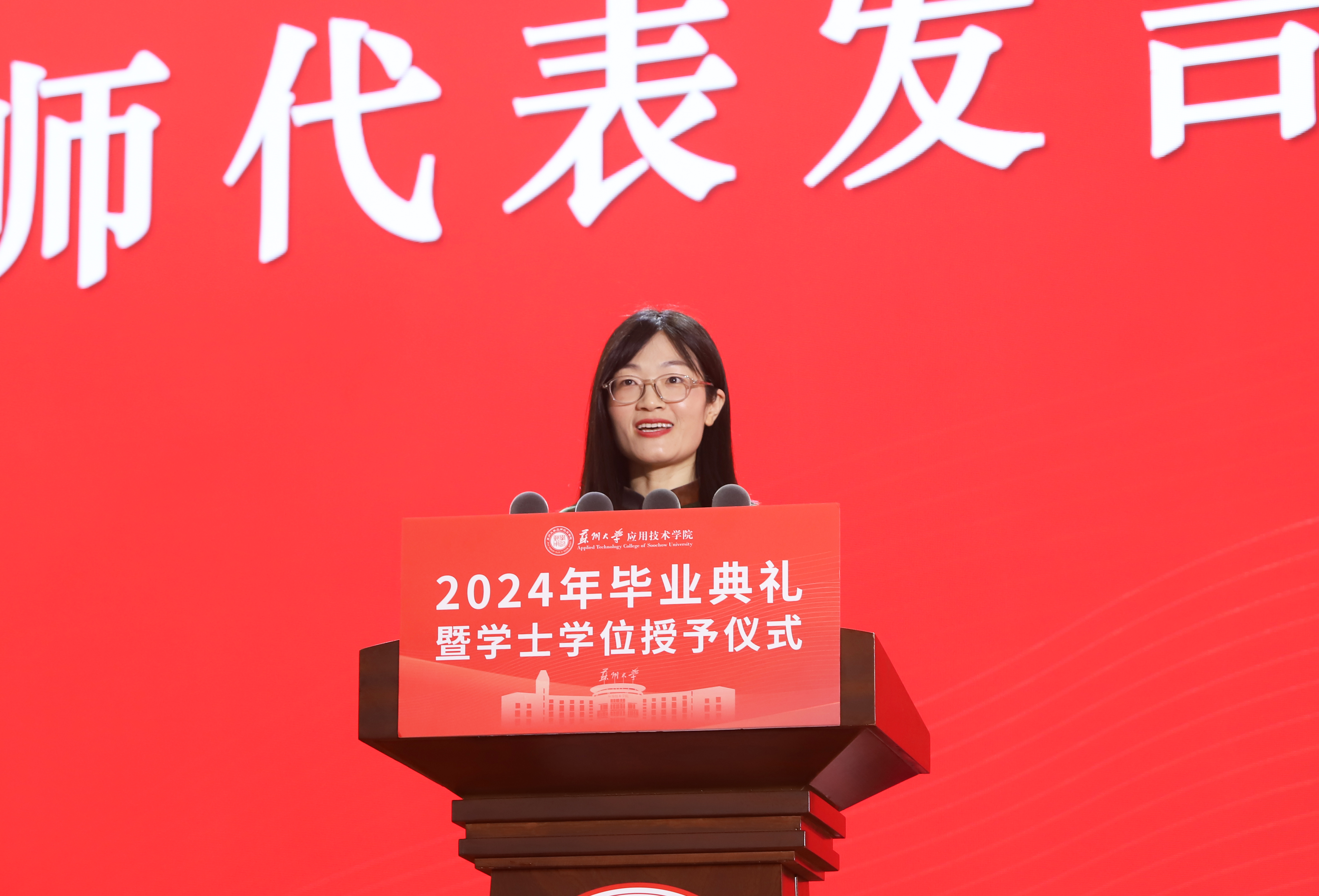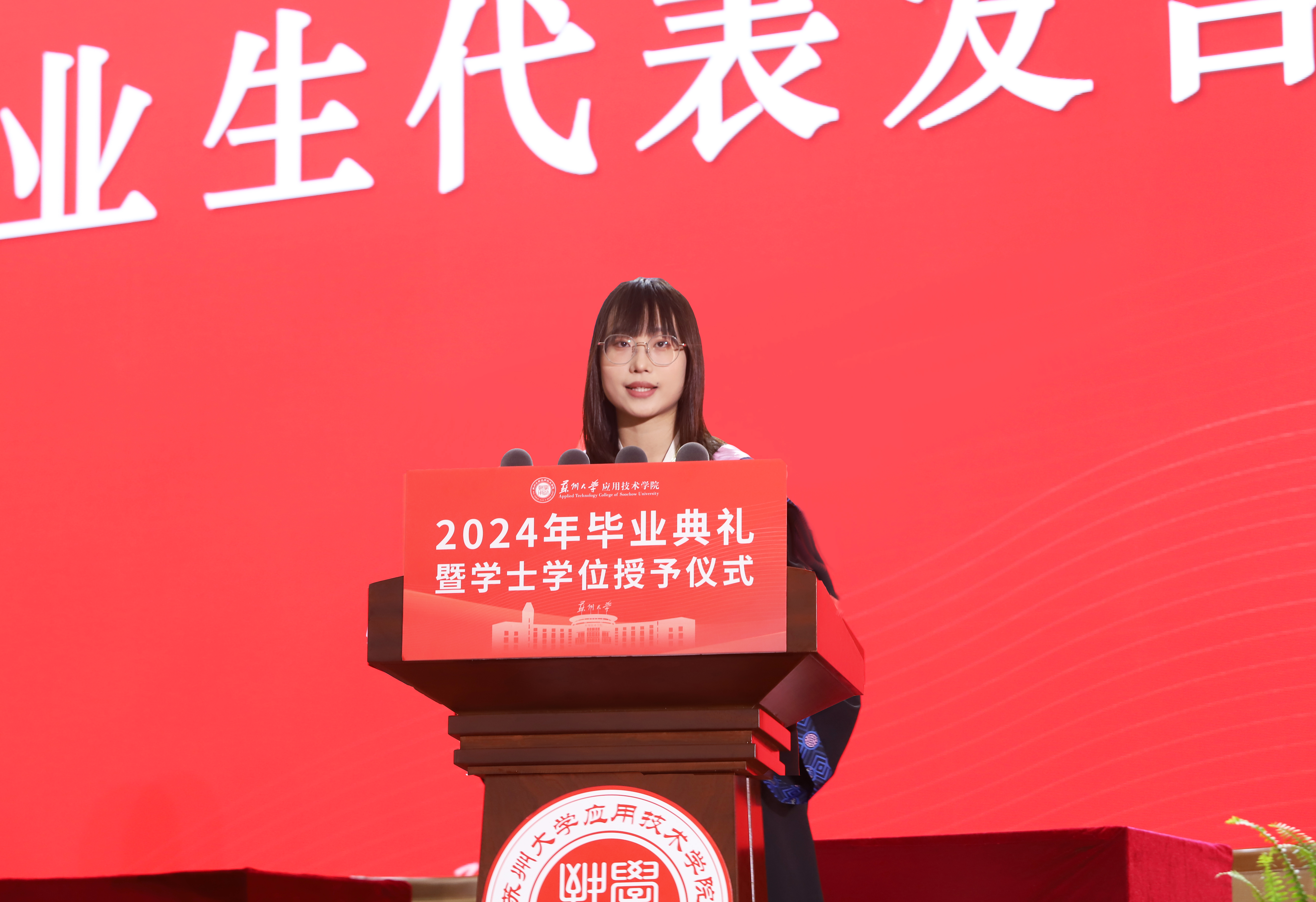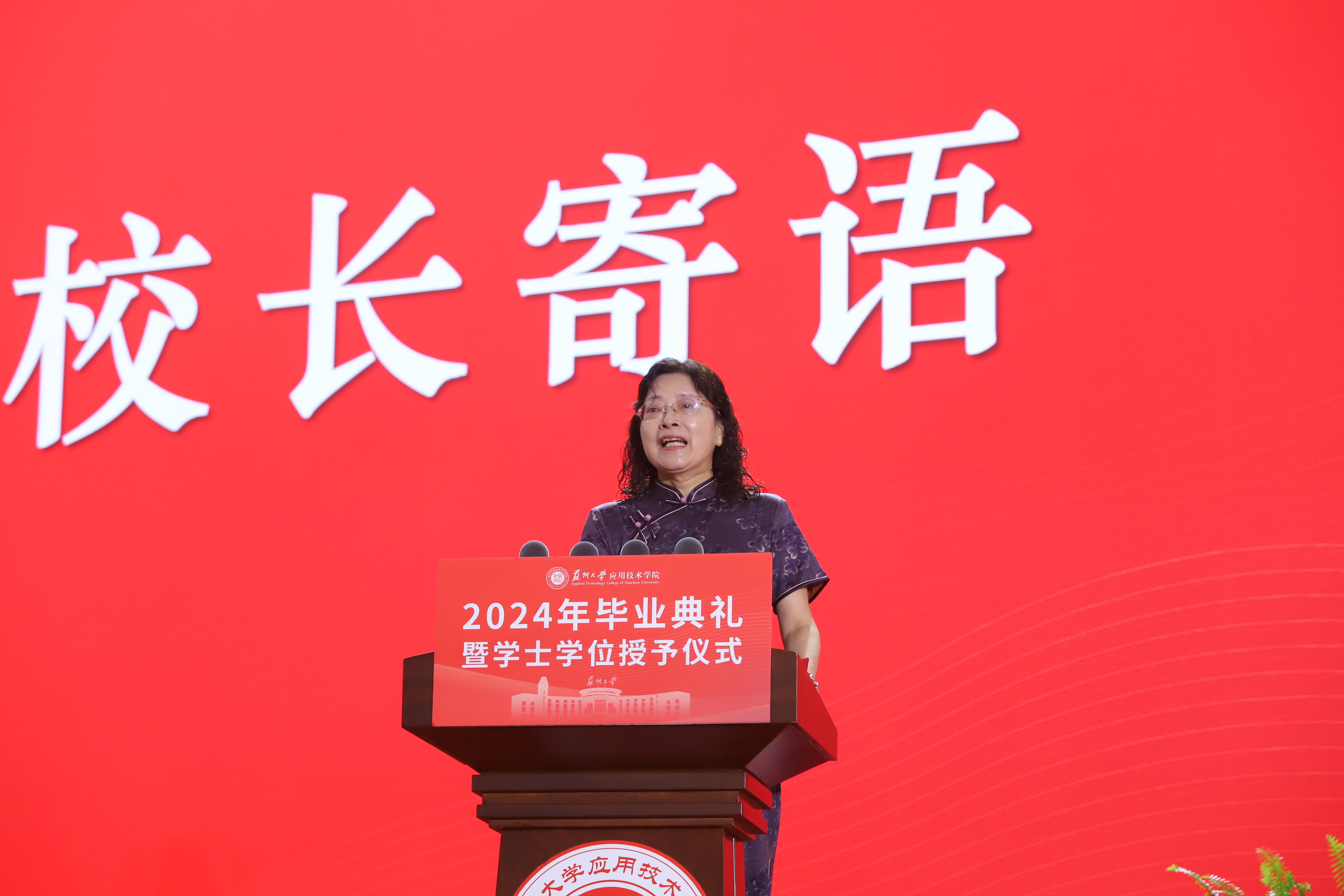 傅菊芬向圆满完成学业、即将踏上人生新征程的2510位本科生致以热烈的祝贺。“四年间,你们更是在各种挑战中发现了自己的无限可能,贡献了各类志愿服务累计14万个小时,无偿献血2.8万毫升,参加社团活动共计3.5万人次,社会实践的脚步覆盖了全国13个省46个市;你们平均每人每年上了683节课,参加了1.2个社团。”傅菊芬院长对毕业生大数据的风趣解读惹得台下学生笑声不断。她指出,四年来,同学们勤于学习、勇于实践,培养了苏应人的情怀、使命和担当,在新中国成立75周年,也是五四运动105周年之际再次唱响“团结起来、振兴中华”的时代强音,接续奋斗、凯歌前行,传承“学以致用”的苏应精神,茁壮成长。同时她也强调,奋斗不只是响亮的口号,而是要在做好每一件小事、完成每一项任务、履行每一项职责中见精神。“每个岗位都是成就人生的舞台,每个个体都能书写不凡的青春华章。脚踏实地、勇往直前,每一滴汗水都将成为中国故事的青春注脚,每一项成就都将会是共和国大厦的坚实支撑。”
