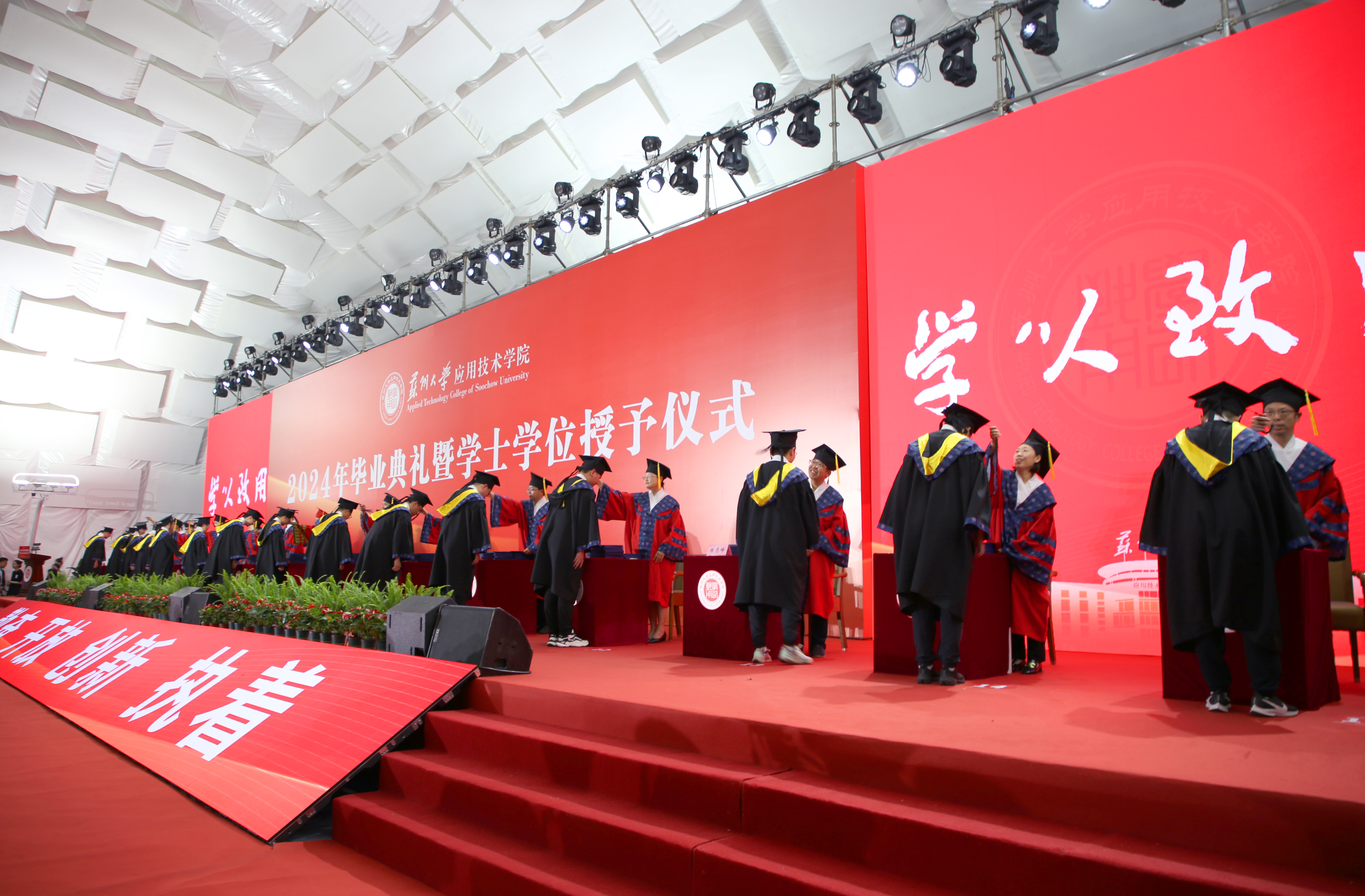 在随后举行的学士学位授予仪式上,到场的2510名2024届毕业生依次登台,由主礼教授为学位获得者授予学位证书、扶正流苏,并合影留念。