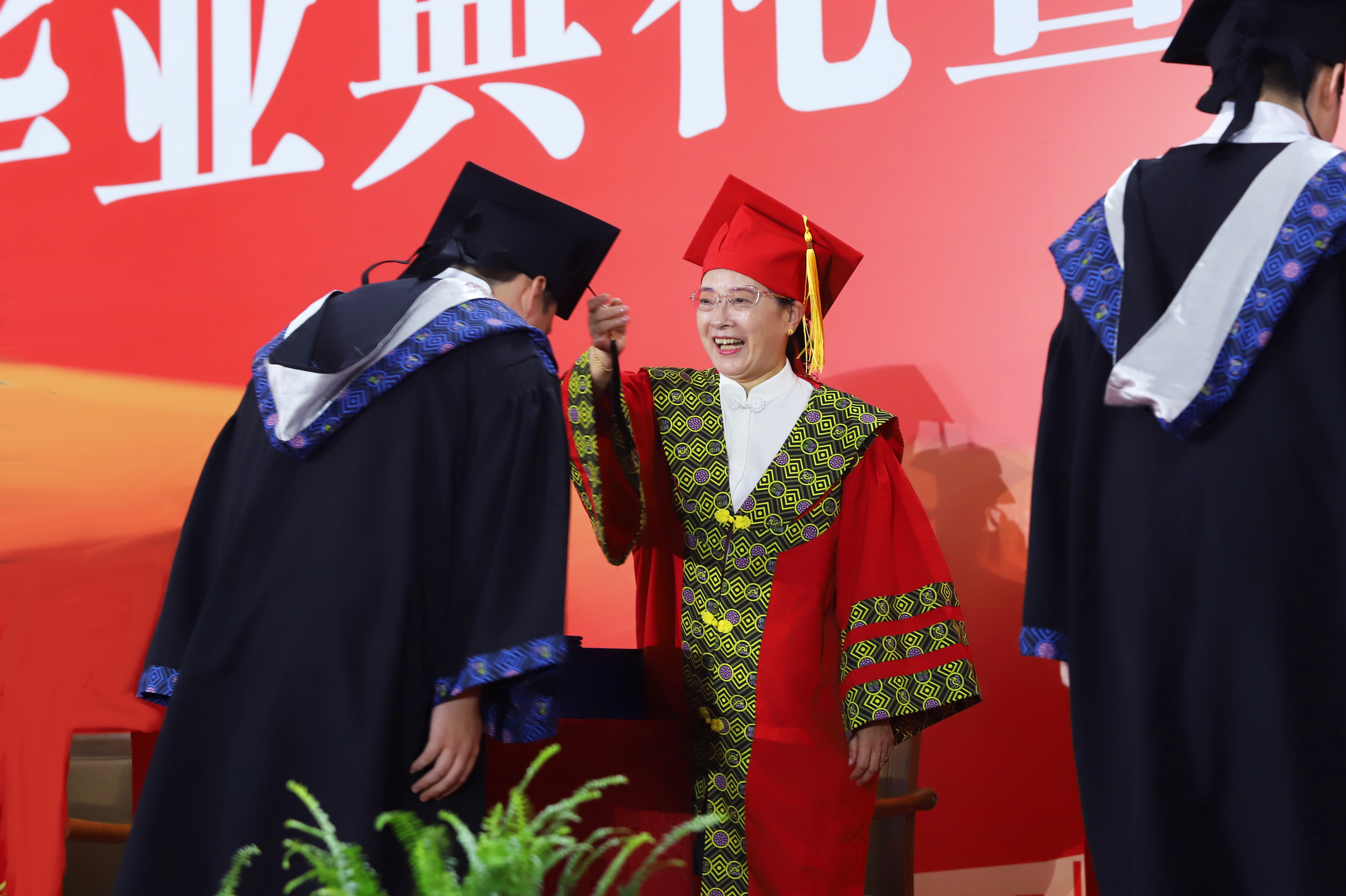 教师代表、文旅学院副院长、服装系主任尹雪峰老师也为毕业生们送上了祝福。她希望同学们在“修身、齐家、治国、平天下”这一层层扩展的过程中不断提升自己。“如‘安如’般坚定沉稳,‘博习’般勤奋好学,‘长风’般勇往直前,‘大成’般追求卓越,‘恩德’般心怀感激,‘孚新’般诚实守信,‘格致’般精益求精,‘和风’般和谐相处”。