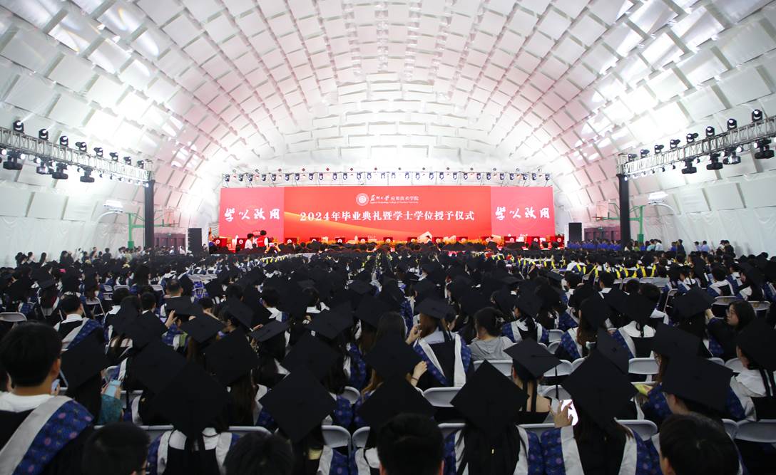 草木青青,桃李灼灼,恰同学少年,意气风发,惜别大学闪光年华,奔赴下一场山海。6月16日上午,苏州大学应用技术学院2024年毕业典礼暨学士学位授予仪式在我院综合馆举行。学院院长傅菊芬,党委副书记、副院长钮秀山,副院长席拥军,纪委书记陈敏,以及文旅学院院长钱继兵、工学院副院长任勇、商学院副院长蒋薇薇等15位学位评定委员会成员,各直属单位负责人、各二级学院领导,教师、毕业班辅导员、部分家长代表以及全体2024届毕业生等近3000人出席仪式。仪式由钮秀山主持。