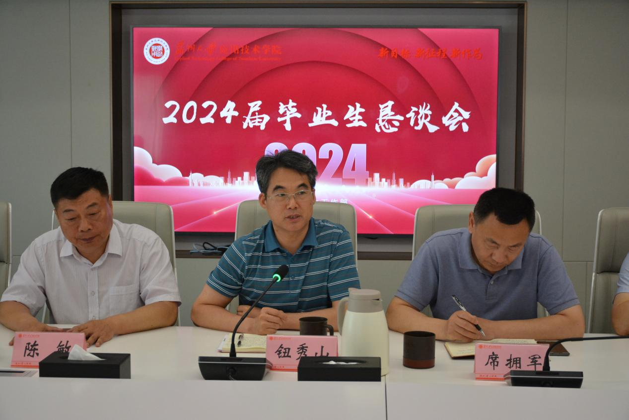 6月14日上午,学院2024届毕业生恳谈会在图书馆512会议室举行。学院党委副书记、副院长钮秀山,纪委书记陈敏、副院长席拥军,各部门、直属单位负责人以及各二级学院党总支书记出席会议,2024届12名毕业生代表参加了本次会议。会议由党委学生工作部部长查伟大主持。