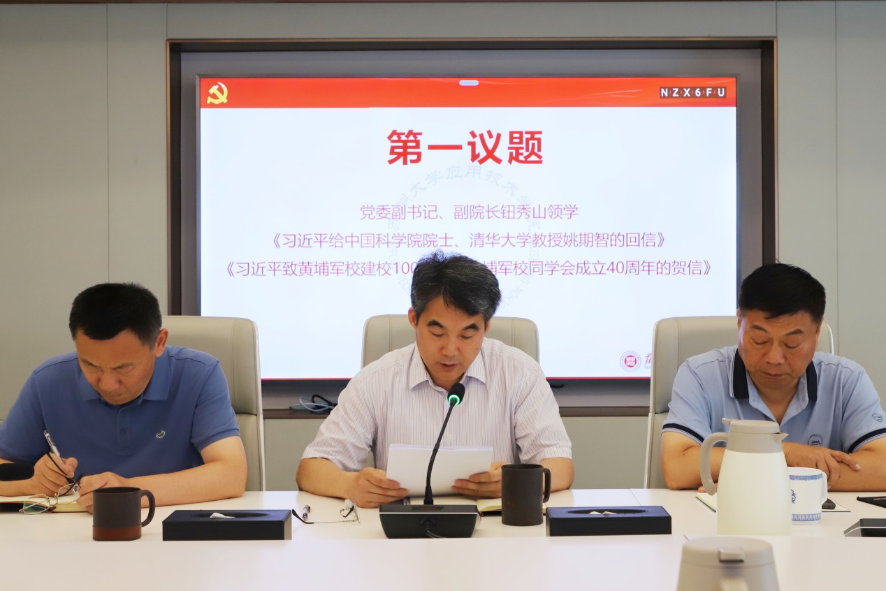 会议第一议程进行第一议题学习,钮秀山领学《习近平给中国科学院院士、清华大学教授姚期智的回信》《习近平致黄埔军校建校100周年暨黄埔军校同学会成立40周年的贺信》。他强调,习近平总书记给中国科学院院士、清华大学教授姚期智的回信,体现了对高校教育科研工作者的关心鼓励及殷切期望,要切实把习近平总书记回信精神落实到位,进一步增强党员干部建设教育强国和科技强国责任感、使命感、紧迫感,积极践行教育和科技工作责任。他指出,广大党员干部要读懂习近平总书记致黄埔军校建校100周年暨黄埔军校同学会成立40周年贺信中的殷殷期许,从中汲取澎湃“奋进之力”,把忠诚政治品格转化为履职尽责的行动自觉。