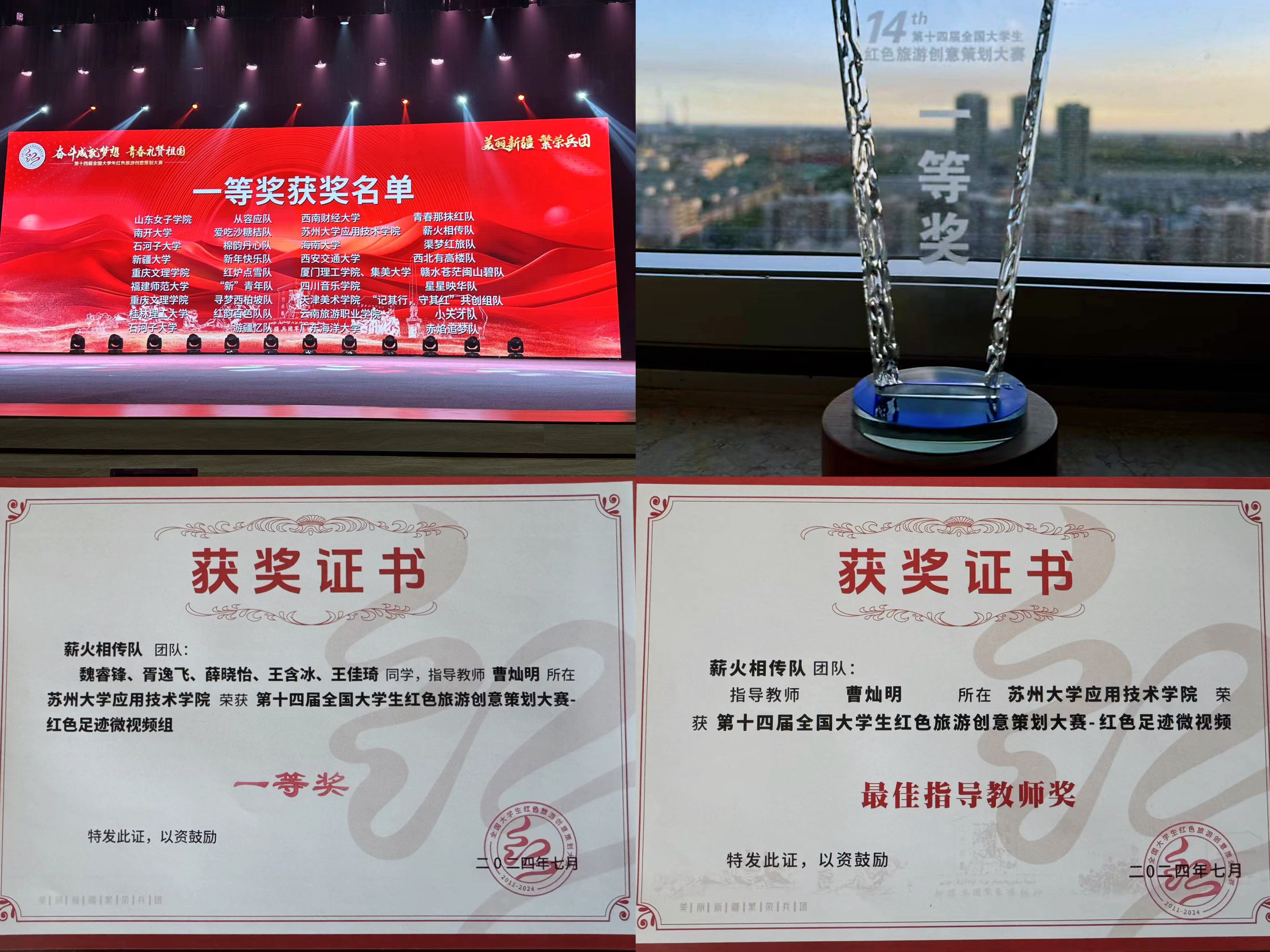近日,第十四届全国大学生红色旅游创意策划大赛总决赛在新疆生产建设兵团石河子市落下帷幕。本届大赛吸引了全国1119所高校、6739支队伍、4万余名师生参与角逐。在经过初赛、复赛、全国总决赛等环节之后,由我院周庄文旅学院学生魏睿锋、胥逸飞、薛晓怡、王含冰、王佳琦等组成的“薪火相传队”,继获华东赛区特等奖后又从全国总决赛的60支队伍中脱颖而出,最终取得学院参加该项赛事历史最好成绩:作品荣获“红色足迹微视频组”全国总决赛一等奖,指导教师曹灿明荣获最佳指导教师奖。