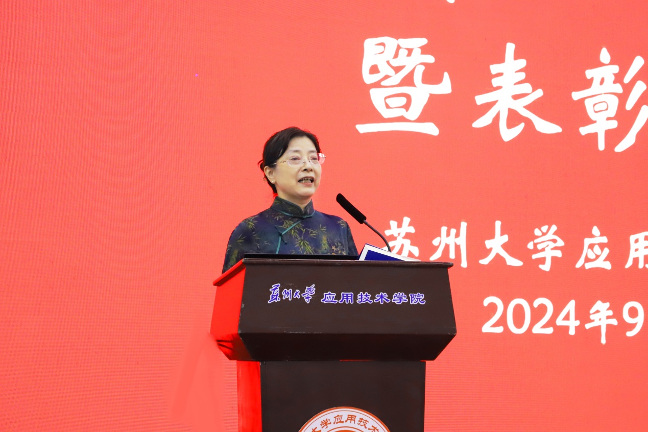 傅菊芬再次向全体教职员工表达了节日祝福,向受到表彰的先进集体和优秀个人表示了祝贺,向退休教职工表示了感谢。她希望全体教师坚定理想信念、厚植爱国情怀、涵养高尚师德、敢于担当奉献,坚持教书和育人相统一,坚持言传和身教相统一,以过硬的教学能力、勤勉的教学态度、科学的教学方法,传道授业解惑,积极开拓创新,与时代同行,努力成为学生锤炼品格、奉献祖国的引路人。她强调,与时代同行需要与时代同频共振、更需要面向未来。她鼓励全院教师要“学在前、想在前、走在前”,要真干、敢干、实干,成为在具体学科领域有专业信仰和学术造诣的学者,成为一个相互信赖、相互支持的共同体,将苏应打造成开放的、广泛吸纳社会资源的文化高地,为推动新时代教育的可持续发展作出苏应贡献。