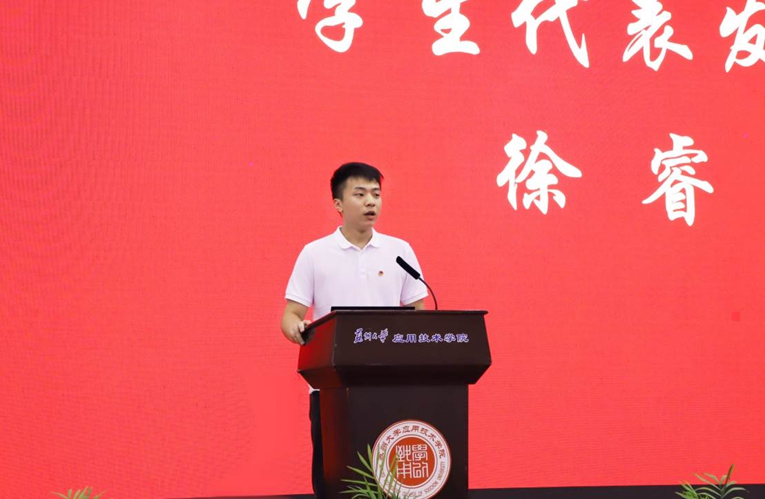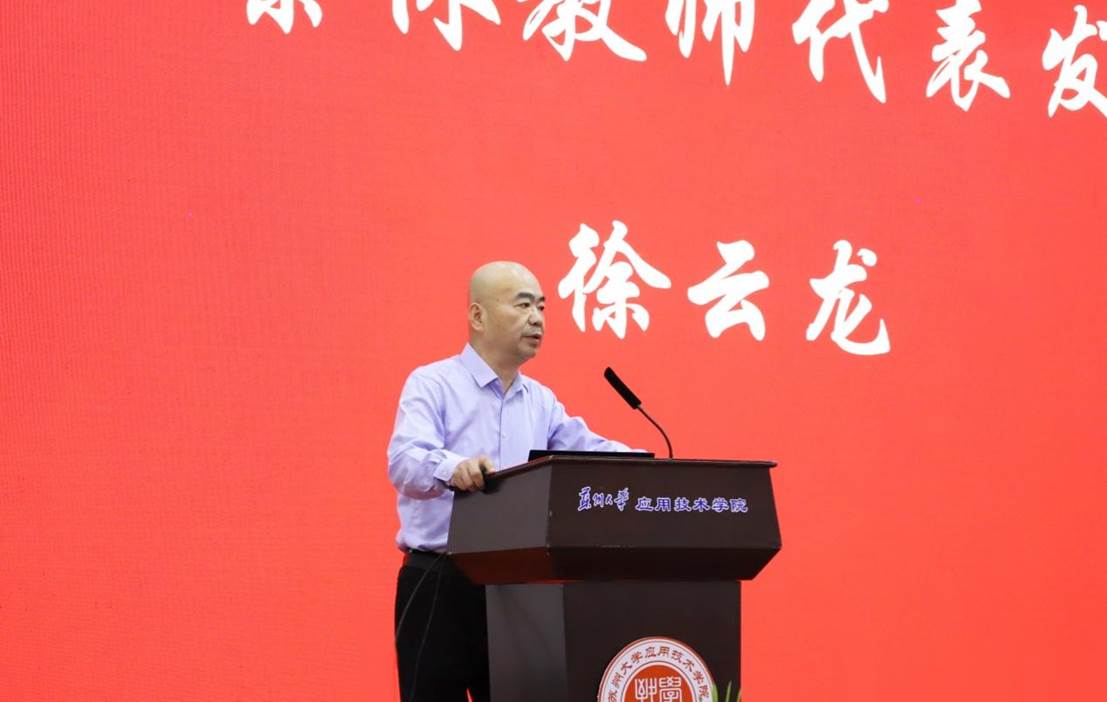 学生代表徐睿发言,为老师们送上了节日的祝福,并对老师们多年来的精心培养表达了诚挚的谢意,他表示一定会学好专业知识,提高综合素质,成为祖国栋梁,用热情、用智慧,与敬爱的老师们一起续写苏应辉煌。