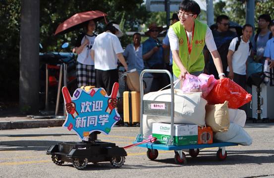 同时,学院迎新也创意十足。为带给萌新们最温暖、最诚挚、最独特的入学体验,各二级学院纷纷拿出“看家本领”,在打卡点、定制礼物、迎新手持牌、机器人拉行李等方面下功夫,新颖有趣的形式,周到温暖的人文关怀,让迎新充满了仪式感。学院安保队员整齐着装执行驻守、巡逻任务,引导人、车有序通行,严守校园师生安全防线;保洁员们时刻保证校园卫生,不放过任何角落的垃圾杂物;班车司机驾驶着大巴车将新生们陆续送至“新家园”;统一着装的志愿者们,活跃在校园各个角落,步履匆匆往返各迎新工作点之间,提供咨询答疑、交通引导、秩序维护、物资分发、行李搬运等多种服务。