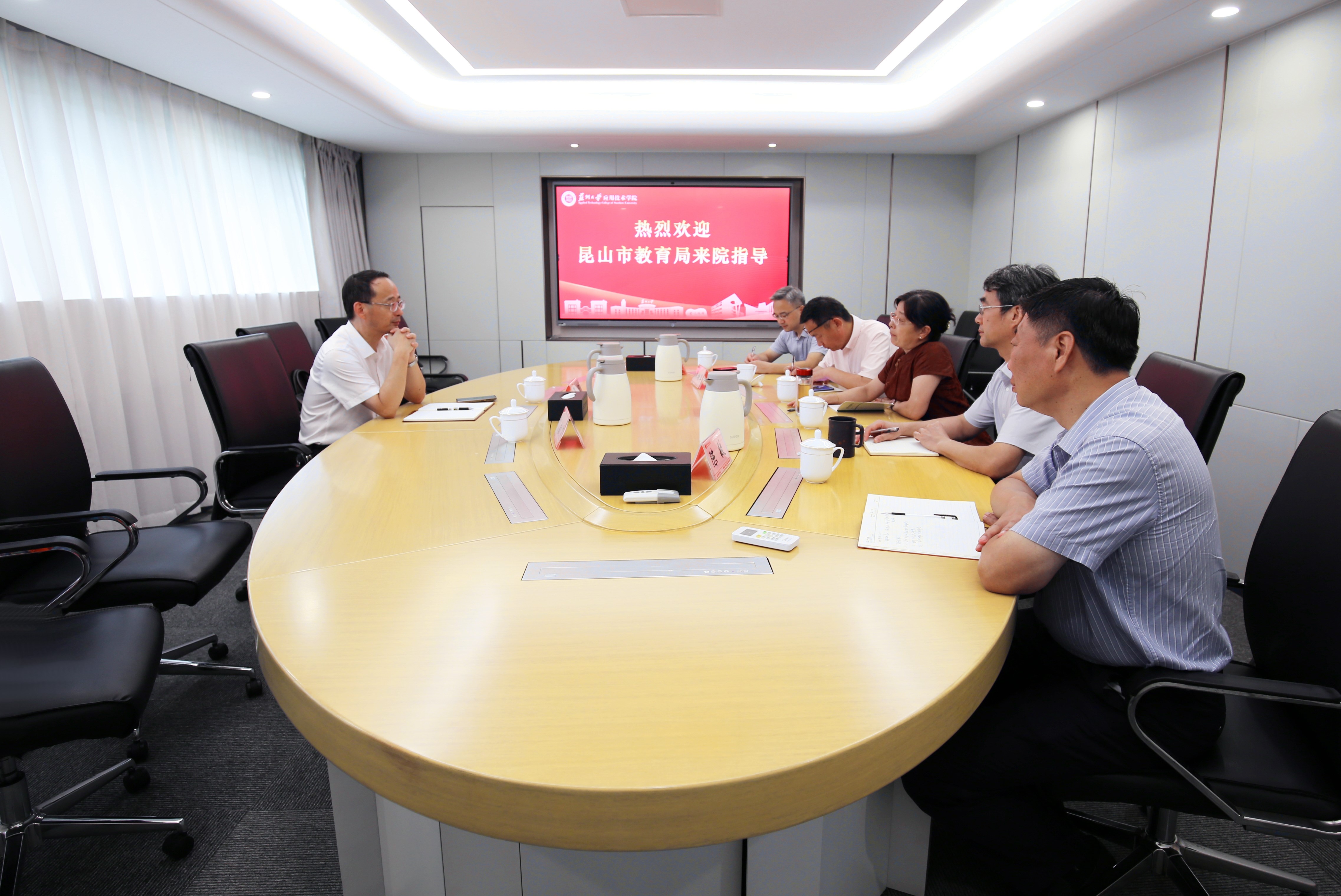 宣讲会后,市委宣讲团成员一行来到行政楼505会议室与学院领导班子进行座谈交流。学院院长傅菊芬介绍了学院基本情况、发展历程、教学科研、近期发展过程中取得的成绩与面临的挑战等方面,学院领导班子其他成员就分管工作分别作简要交流。昆山市委教育工委书记、市教育局局长王阳对我院近年来高质量发展成效给予了高度肯定,并对我院长期以来培养应用型本科人才、服务区域经济社会发展表示了高度赞扬。他表示,苏州大学应用技术学院作为地处昆山的应用型本科高校代表,期望学院能发挥高校的智力资源、专业优势,主动融入昆山市发展战略,持续为昆山输送更多创新型、复合型的高技能人才,在昆山打造中国式现代化的县域示范新征程中贡献更多高校力量。