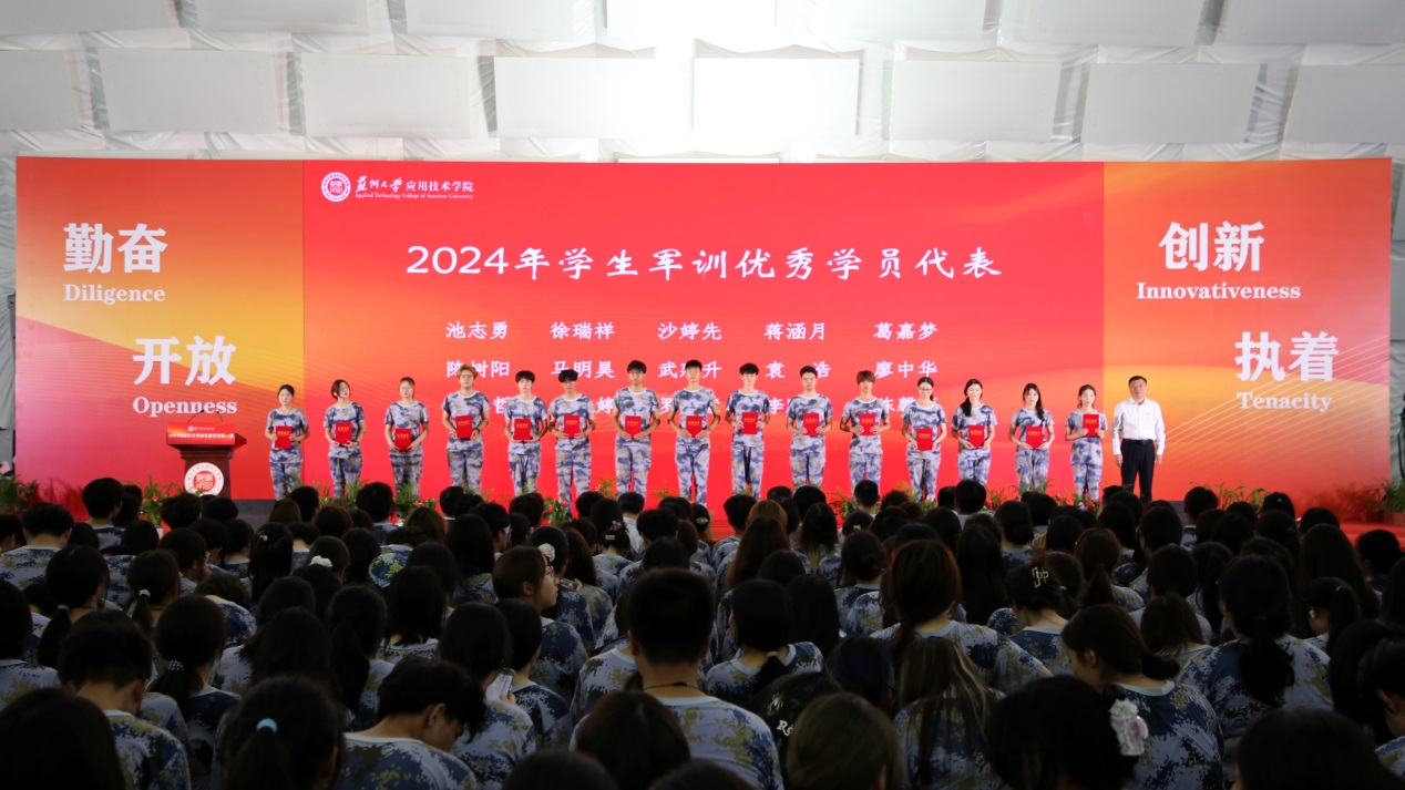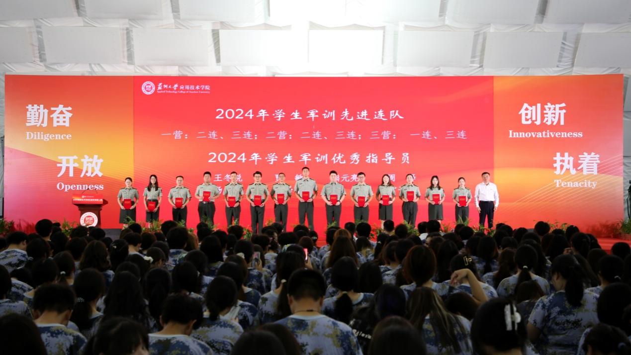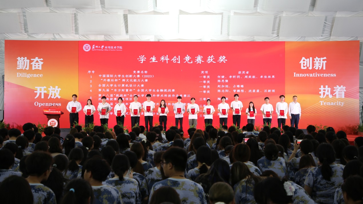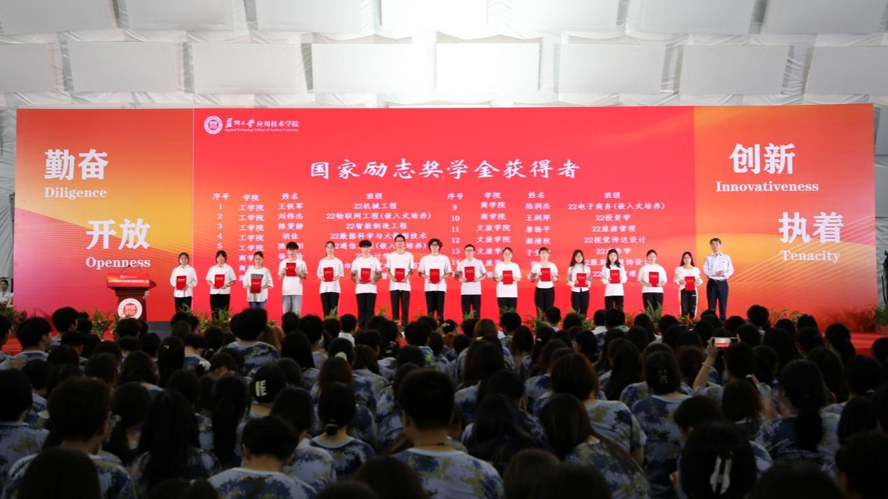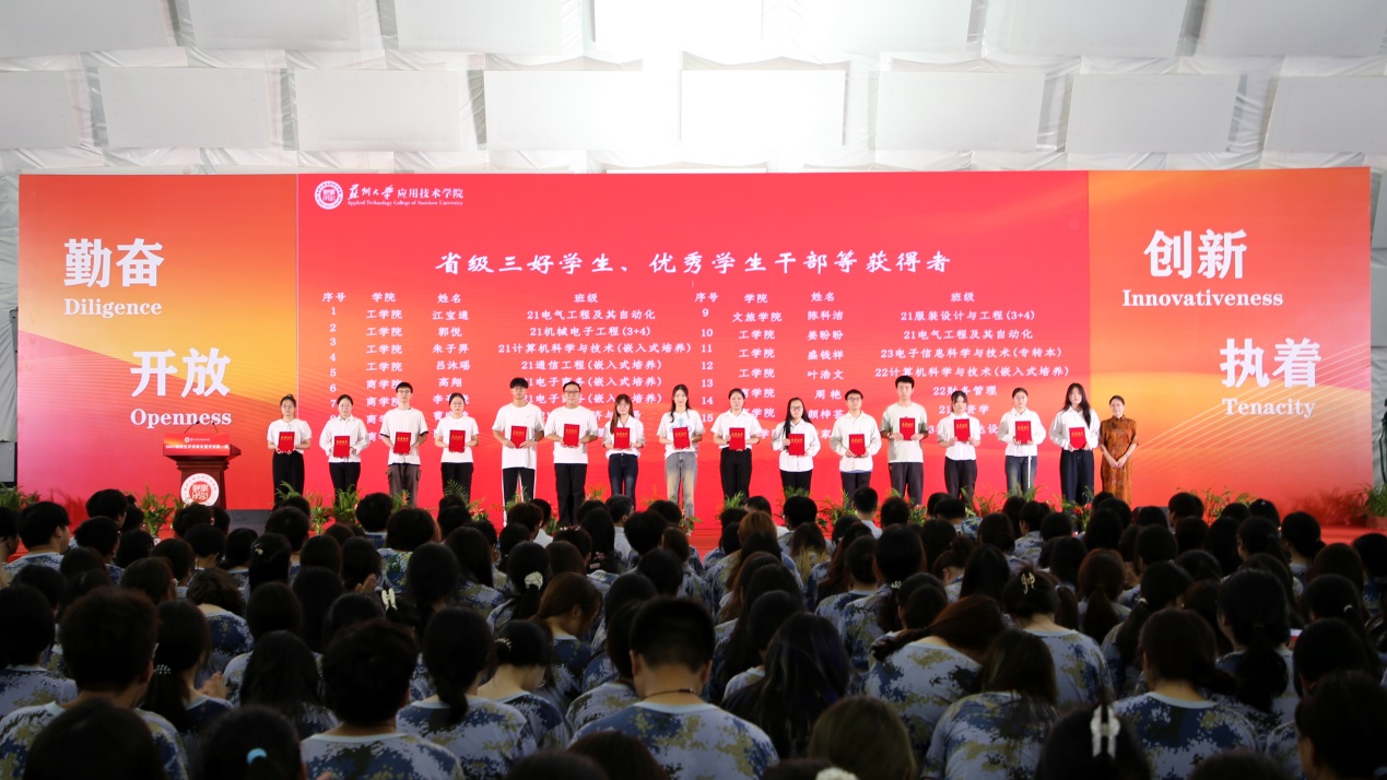 随后,大会进入颁奖环节,对苏应学子在军事训练、学术成长、科创竞赛和志愿服务等领域的突出成绩进行特别表彰。