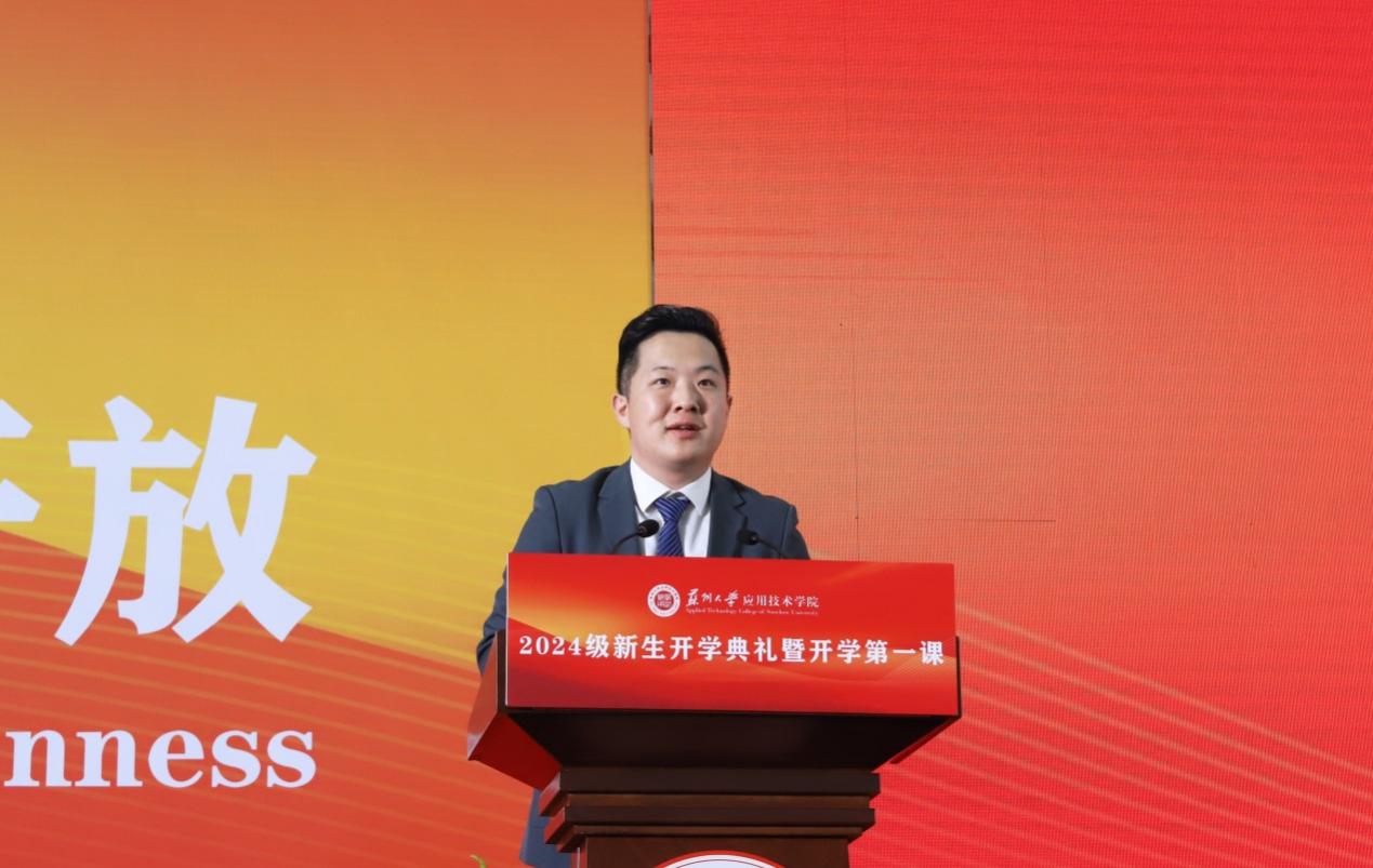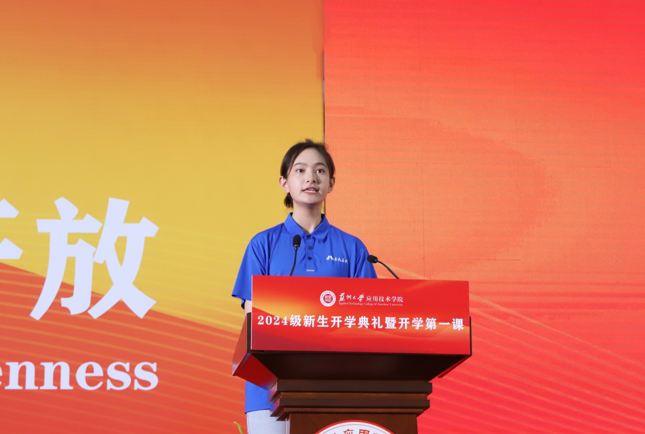 2024级市场营销专业的王滢涵作为新生代表发言,充分展现出立志在大学阶段取得新成绩的坚定底气。她决心努力展现青春作为,彰显青春风采,贡献青春力量。王滢涵发出这样的倡议:“以谦逊之心求知,以务实之态做事,以积极之姿成长。希望我们能够在苏大应用里看到更广阔辽远的图景。风正潮平,自当扬帆破浪;任重道远,更须快马加鞭。一鸣从此始,奋斗恰如时。”
