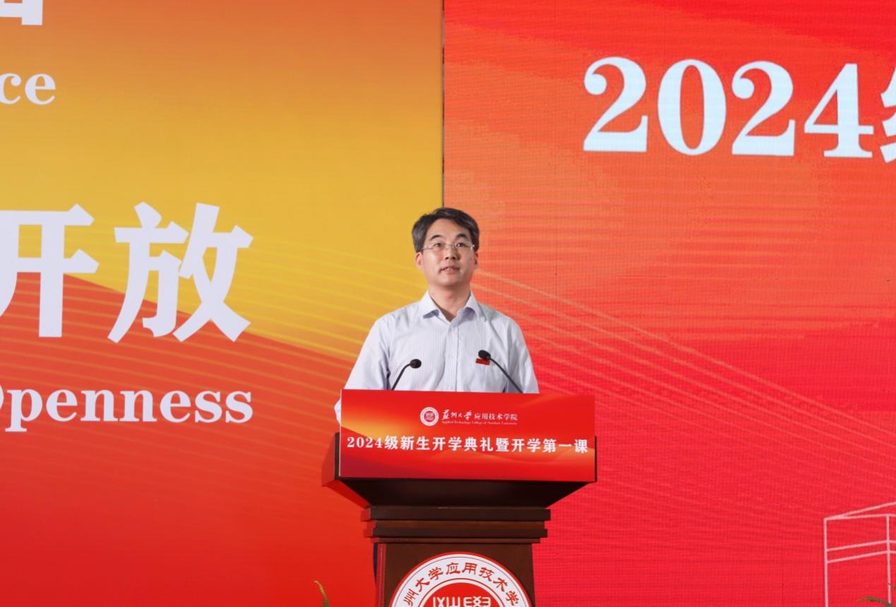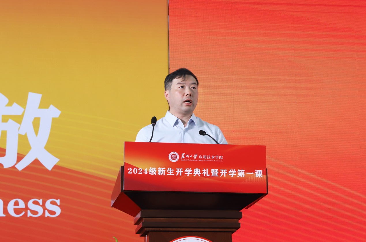 典礼上,傅菊芬院长代表学院向全体2024级新同学们表示热烈欢迎,她深情寄语全体新生并讲授“开学第一课”。“今天,2849名‘苏小应’加入了我们苏应大家庭。我代表全院师生员工,向你们表示衷心的祝贺和热烈的欢迎,并借此机会,向哺育培养你们的家长老师和关心支持你们的社会各界致以亲切的问候和诚挚的感谢!”