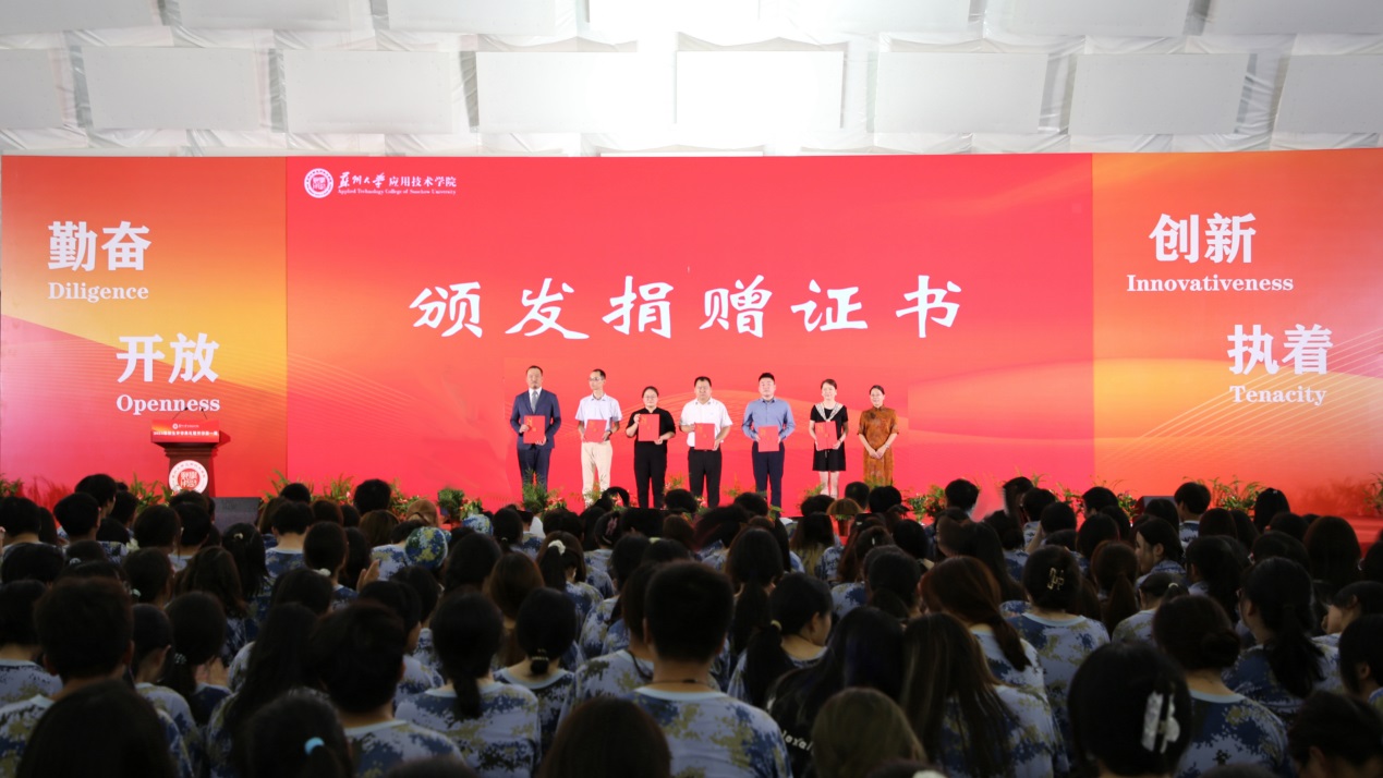 典礼上,还举行了颁发捐赠证书仪式,由捐赠企业向积水奖学金、中外运奖学金获得者代表颁发证书。一直以来,学院高度重视与各企业之间的合作交流,深入推进访企拓岗行动。积水中间膜(苏州)有限公司、中国外运长江有限公司苏州分公司、苏州同里湖大饭店有限公司、亚德客国际集团、苏州金螳螂公益慈善基金会、宁波银行苏州分行等企业代表特别受邀出席开学典礼,傅菊芬为长期以来支持学院发展的各企业授牌,以表达学院对这些企业的诚挚感谢与敬意。