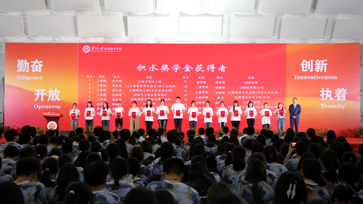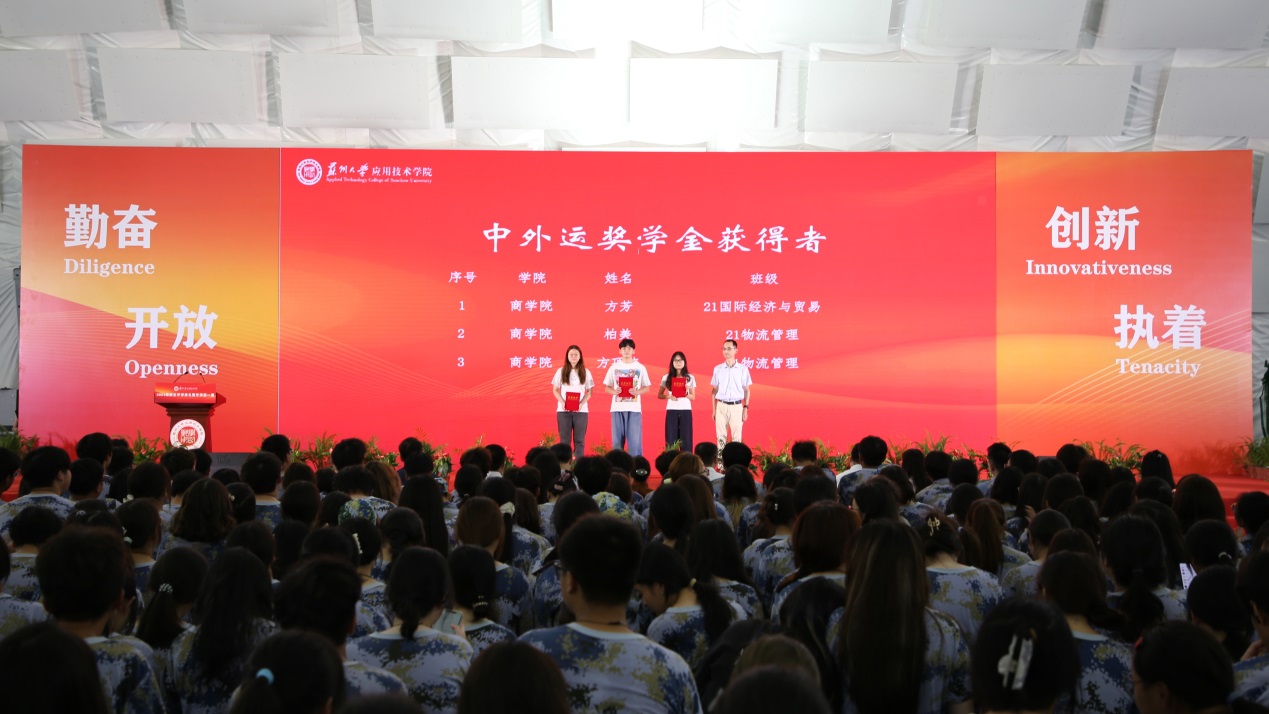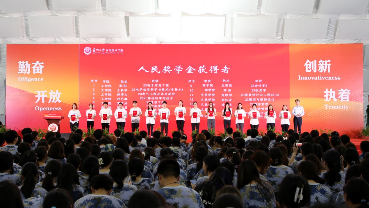 陈敏为军训工作优秀指导员、优秀连队、优秀学员颁奖;席拥军为获得国家级、省部级科创竞赛的获奖学生代表颁奖;钮秀山为国家励志奖学金、学院人民奖学金特等和一等奖获得者代表颁奖;傅菊芬为获得江苏省三好学生、优秀学生干部,学院三好标兵、优秀学生干部标兵、三好学生等荣誉称号的学生代表颁奖。展望未来,学院仍将坚定不移继续深化价值引领,着重培养学生各方面的志趣,大力促进苏应学子全面发展。相信在学院的精心培育下,苏应学子们必将在未来的道路上绽放更加绚烂的光彩,为自己的人生书写辉煌篇章,为社会的发展贡献青春力量。