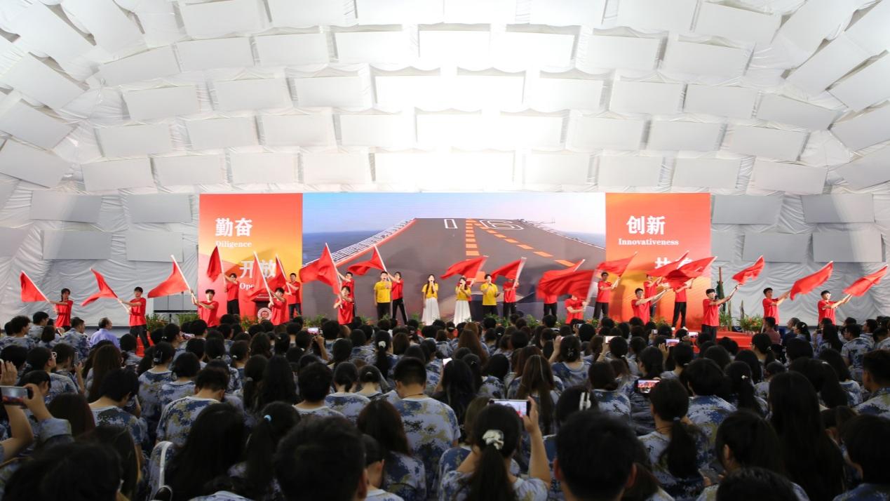 典礼开始前,现场播放了2024级新生军训汇演的视频集锦,集中展示了新生为期半个月的军训成果。学生军训团步伐掷地有声、口号铿锵有力,参训学员的军体拳、匕首操、战术格斗等动作整齐划一,充分展现了苏应学子不畏艰难、勇往直前的坚定信念,展现了过硬的军事素质与本领。视频中不时出现的生动画面,赢得了现场学生的阵阵掌声。